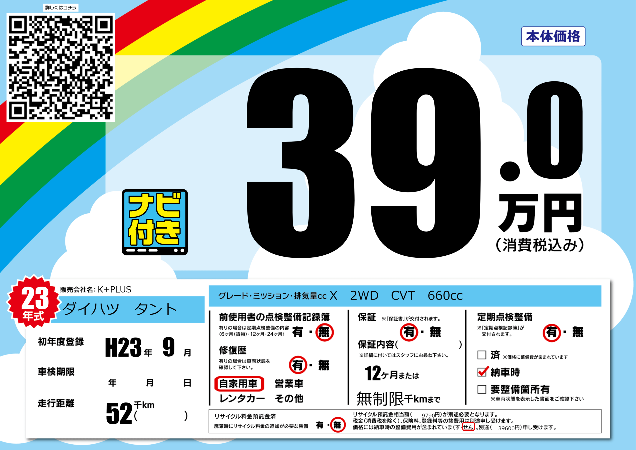 | 走行キロ | 5.2万km | 初年度登録 | H23年9月 |
