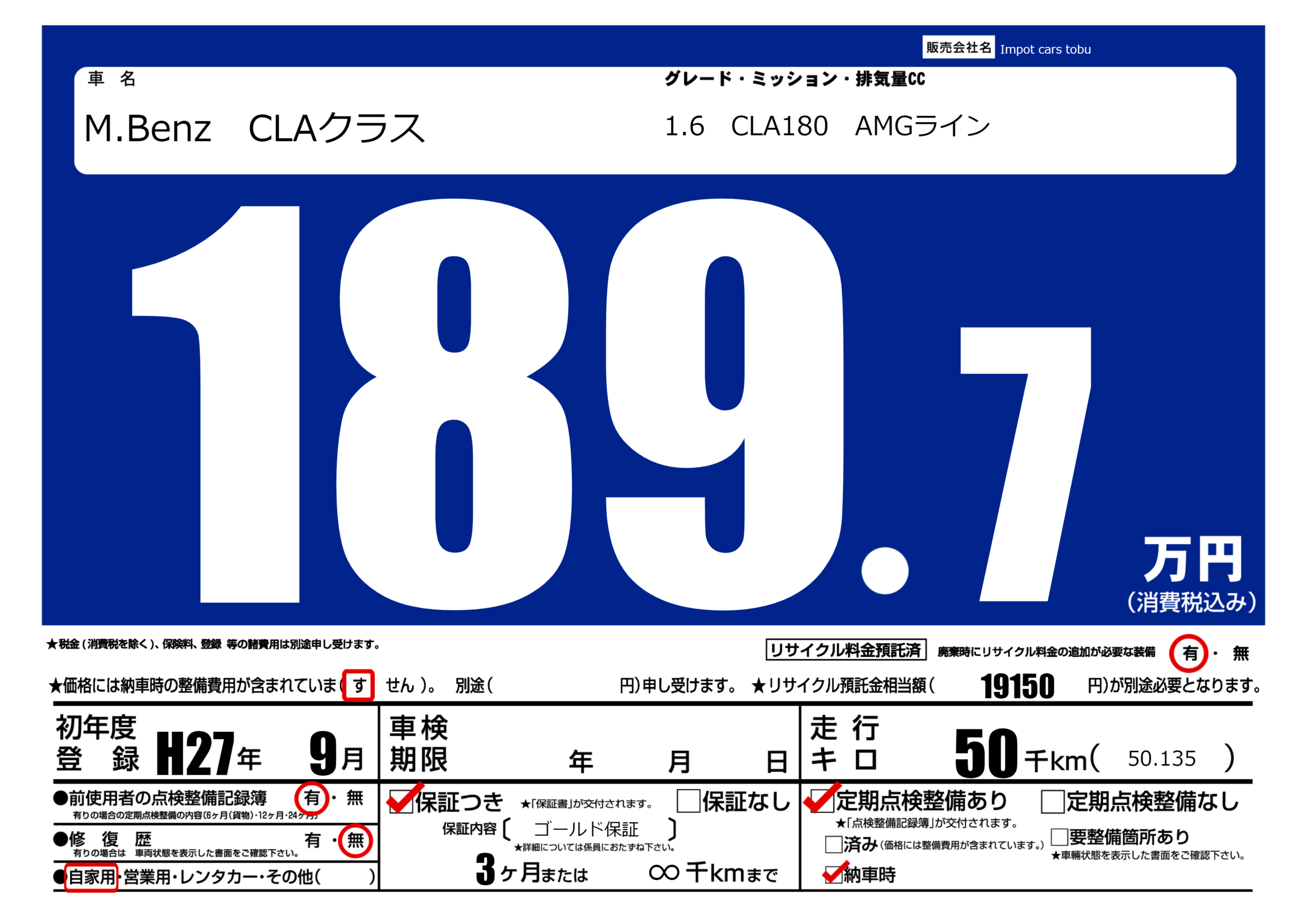 | 車名 | M.Benz CLAクラス | グレード ミッション 排気量 |