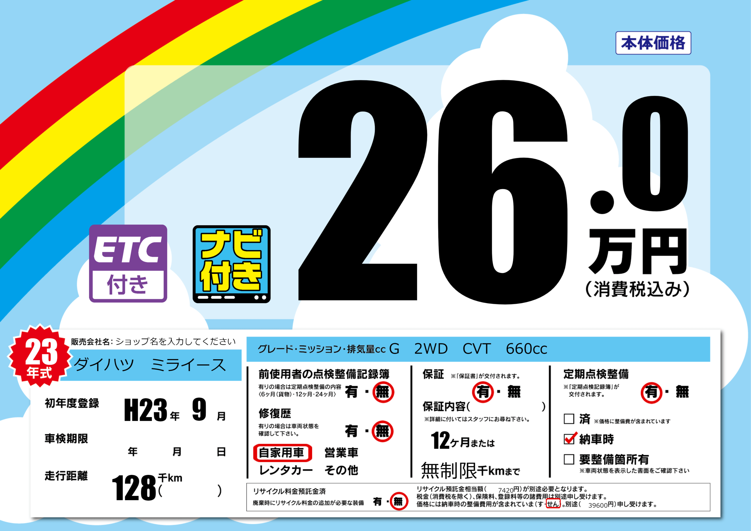 | 走行キロ | 12.8万km | 初年度登録 | H23年9月 |