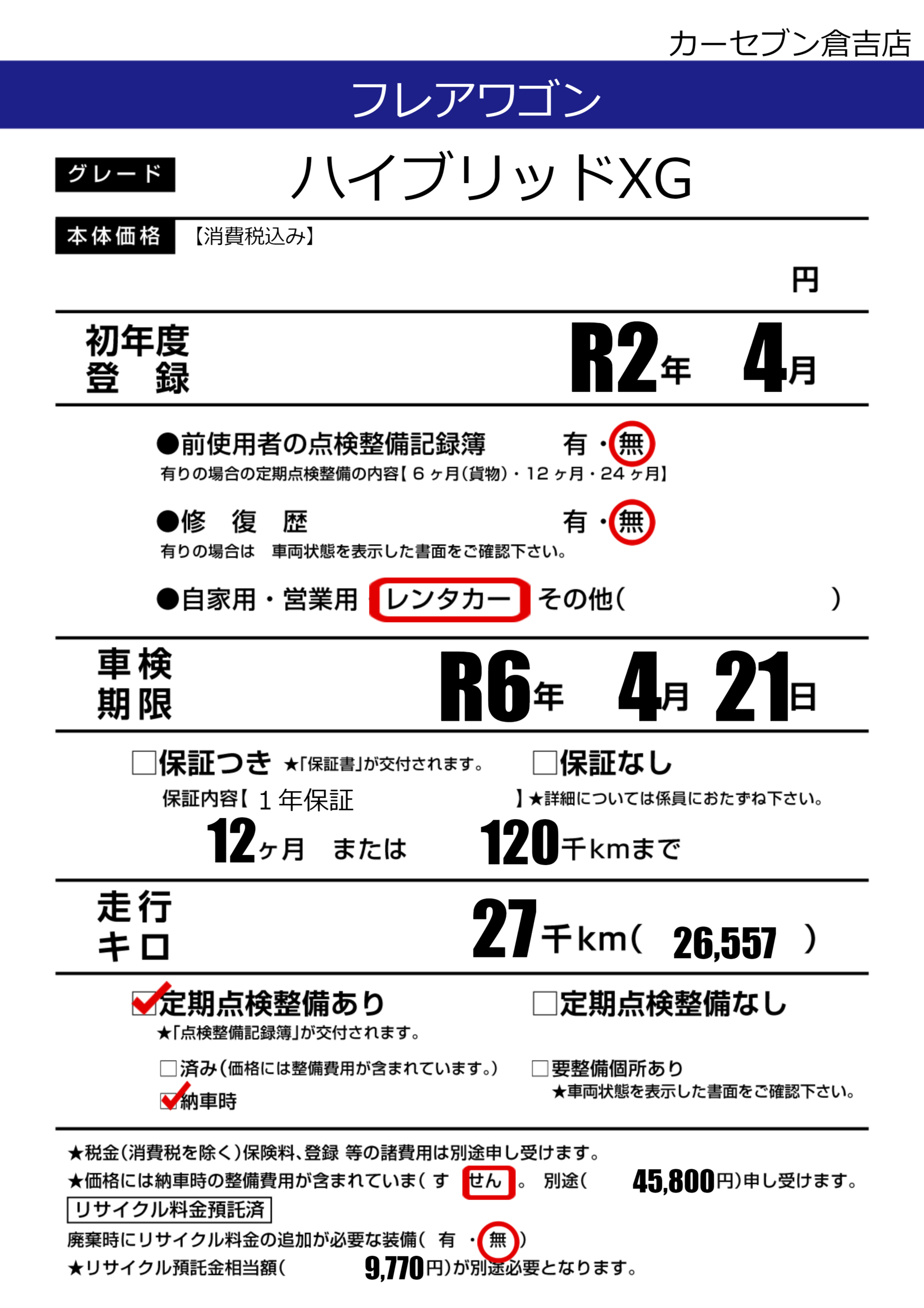 | 車名 | フレアワゴン | グレード ミッション 排気量 |