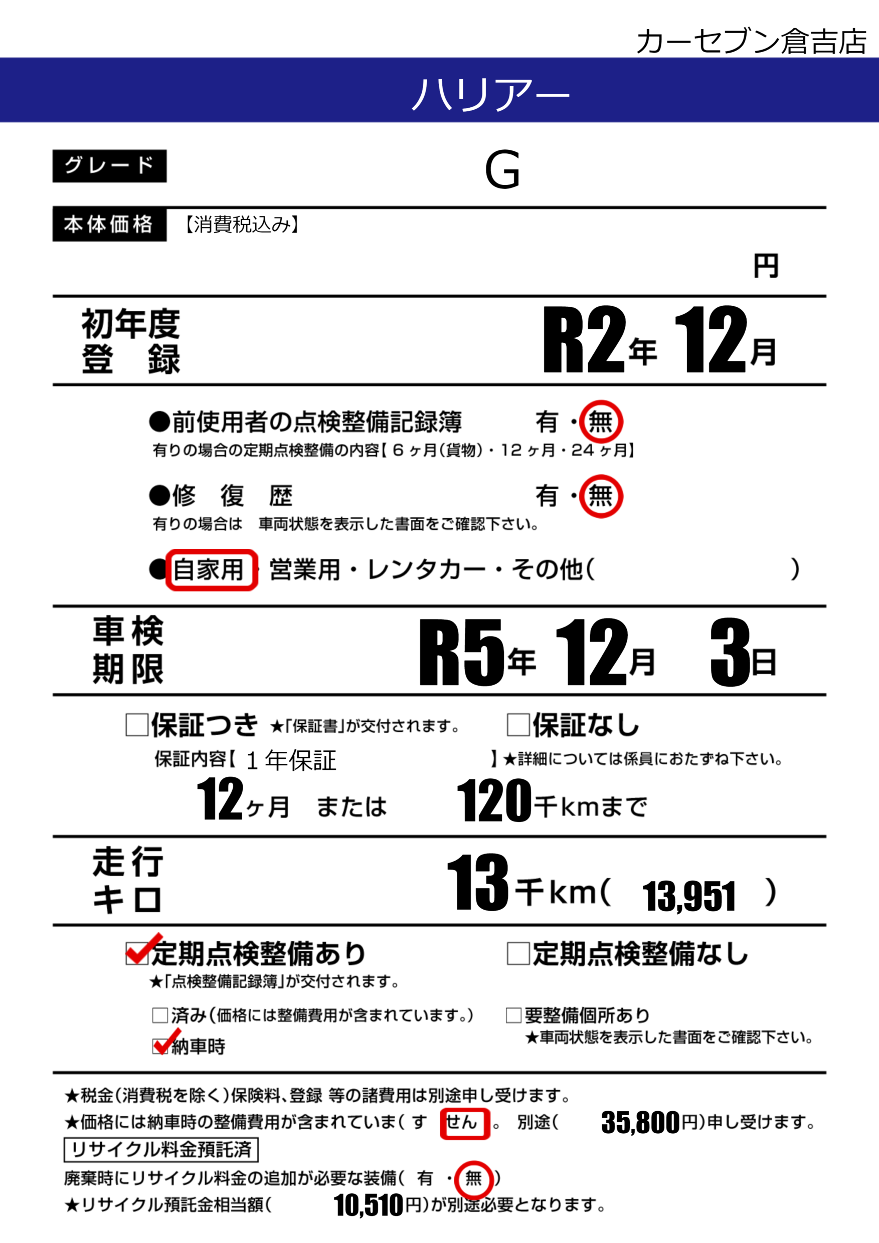 | 走行キロ | 1.3万km | 初年度登録 | R2年12月 |