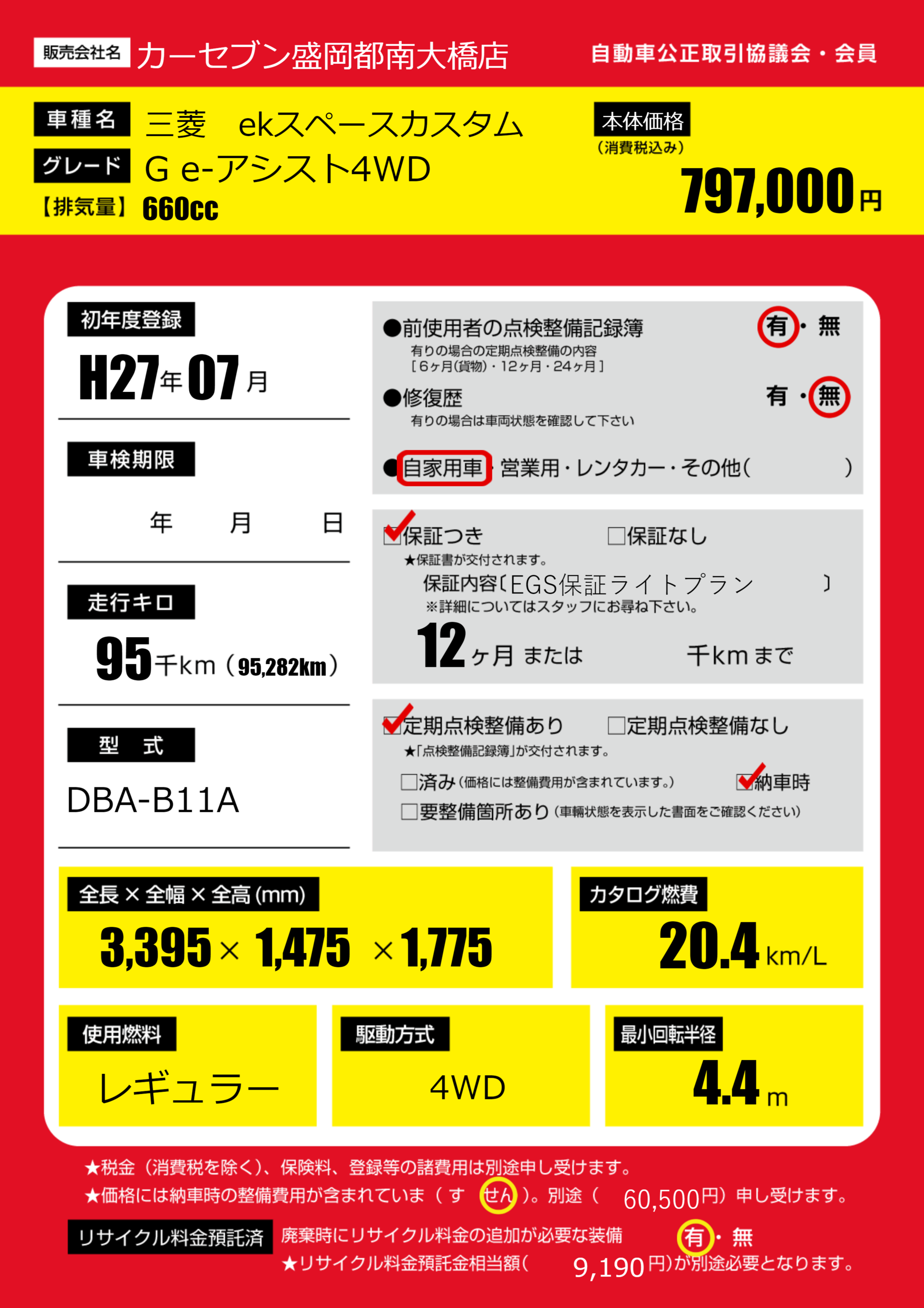 | 車名 | 三菱 ekスペースカスタム | グレード ミッション 排気量 |