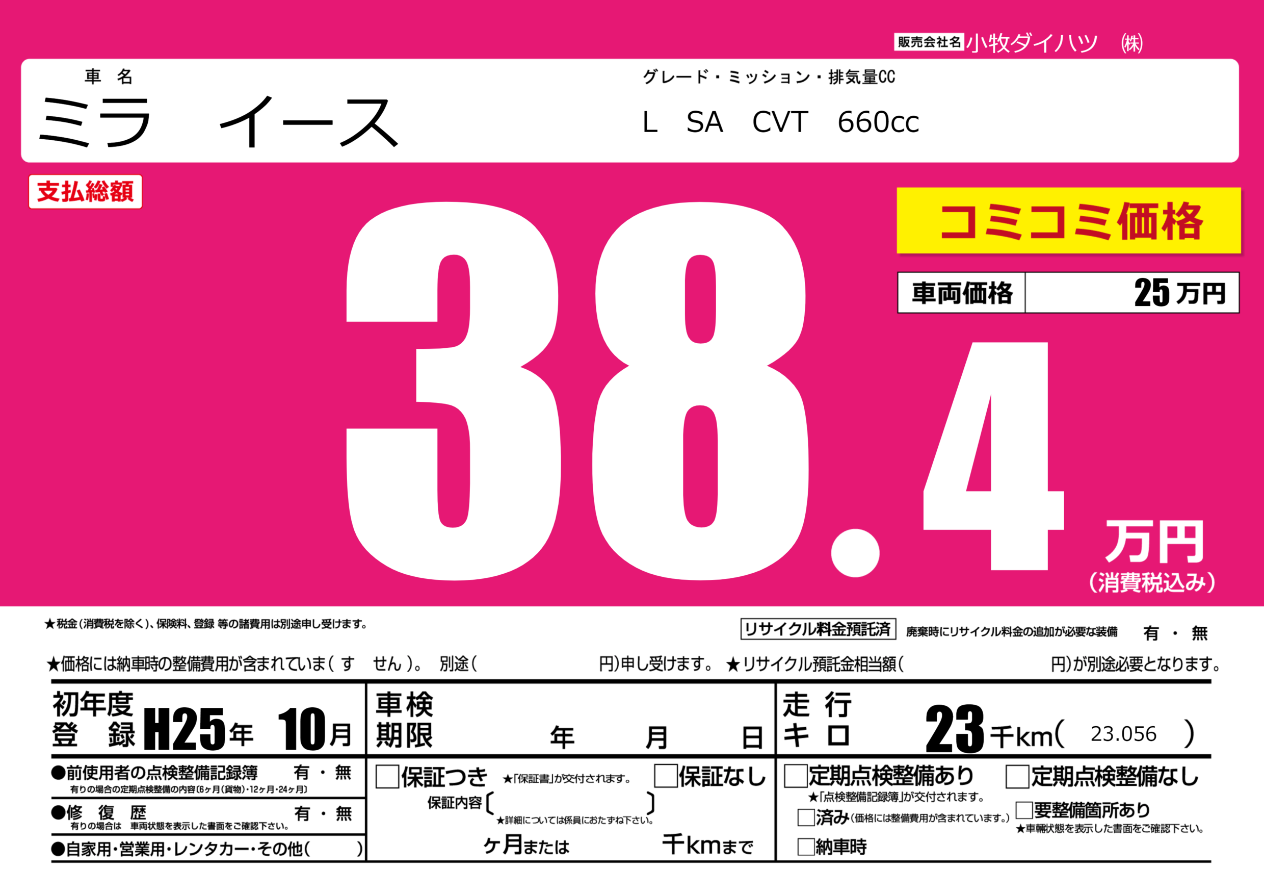 | 走行キロ | 2.3万km | 初年度登録 | H25年10月 |