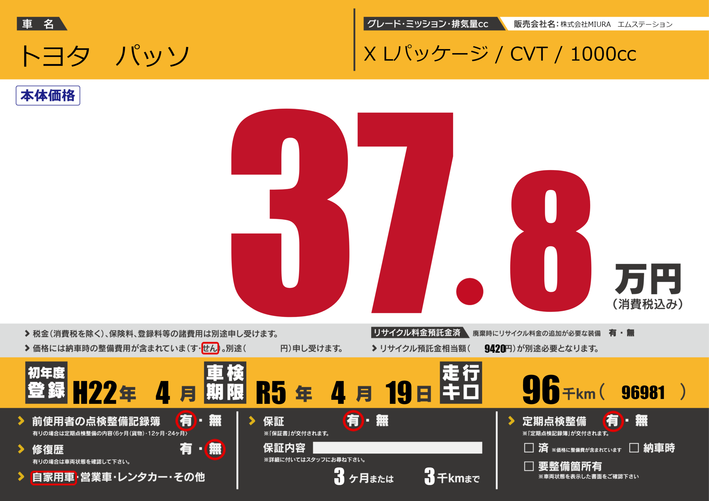 保証付き 保証内容(---) 3ヶ月または(3)千kmまで |