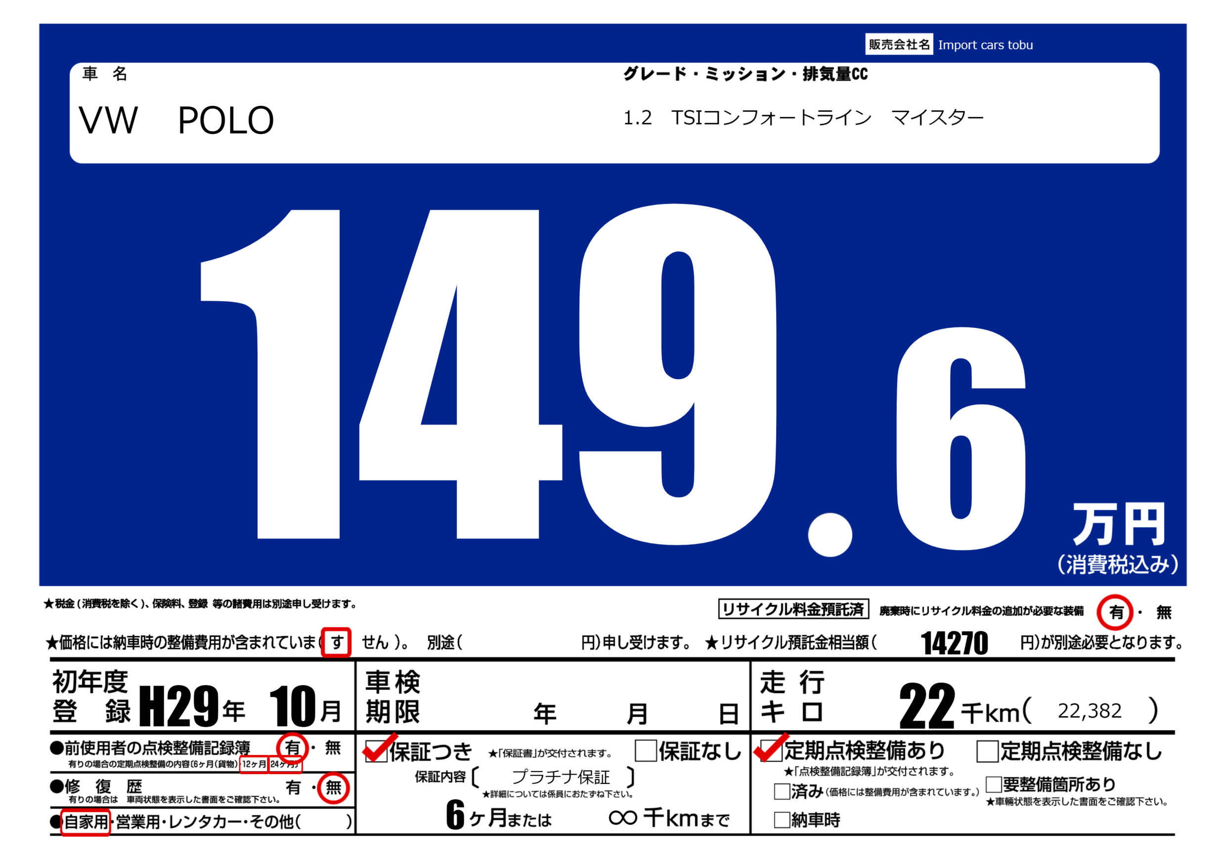| 車名 | VW POLO | グレード ミッション 排気量 |