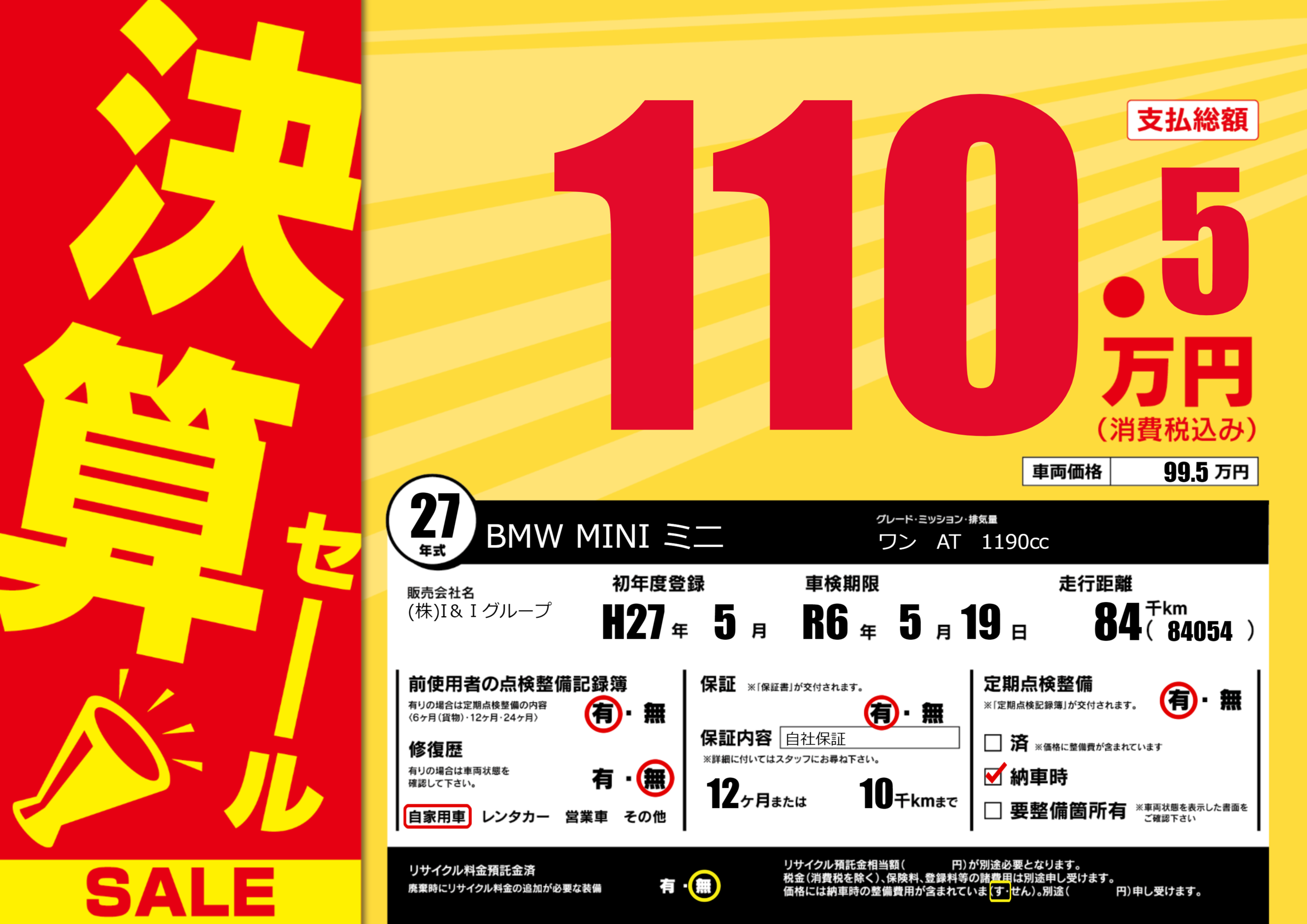 | 定期点検整備 | 定期点検整備あり 納車時あり | ||