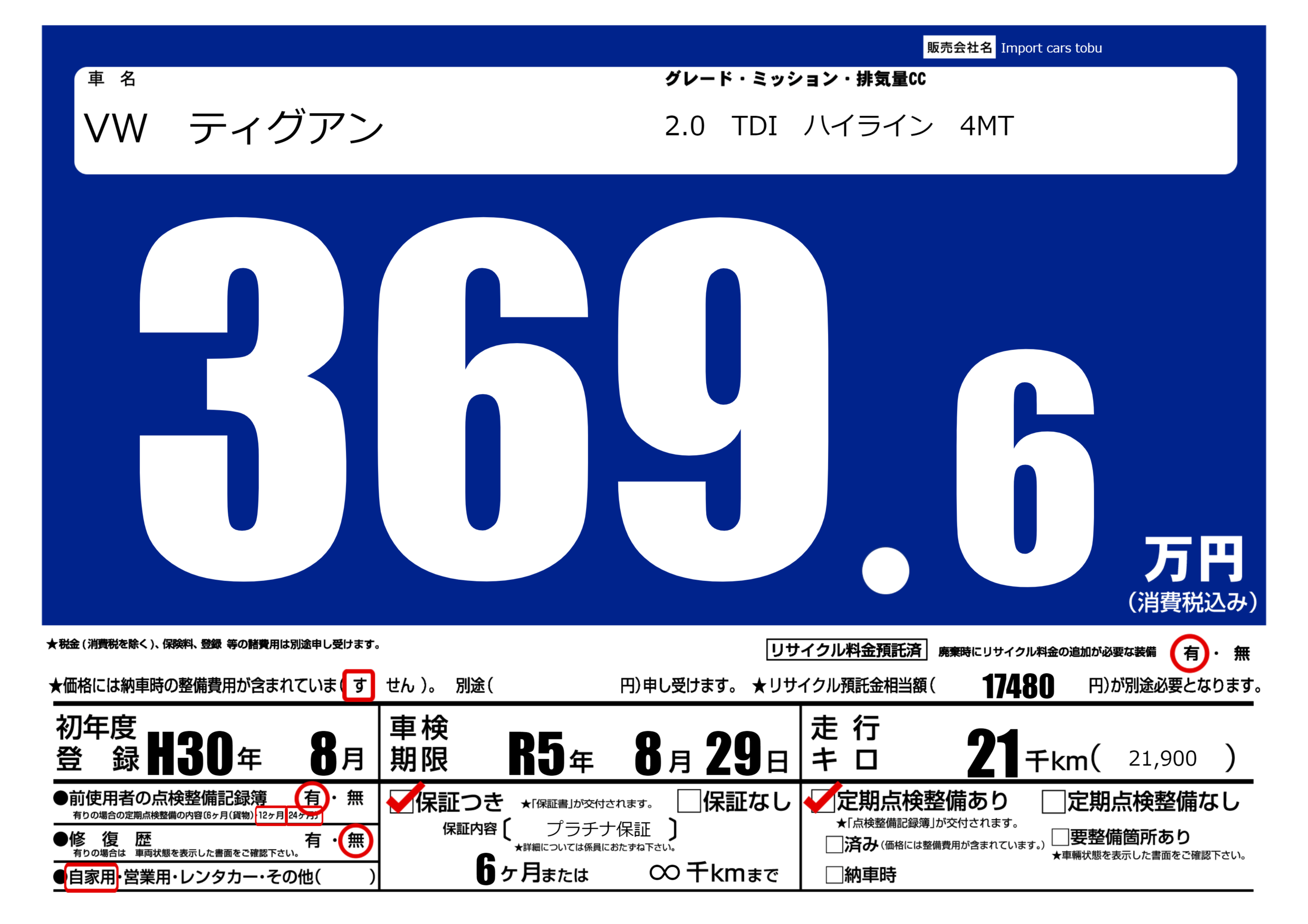 保証付き 保証内容( プラチナ保証) 6ヶ月または(∞)千kmまで |