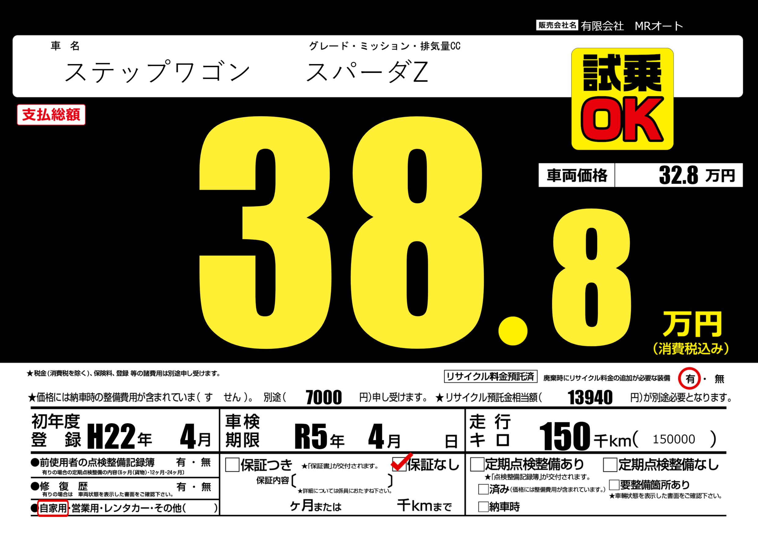 | 走行キロ | 15万km | 初年度登録 | H22年4月 |