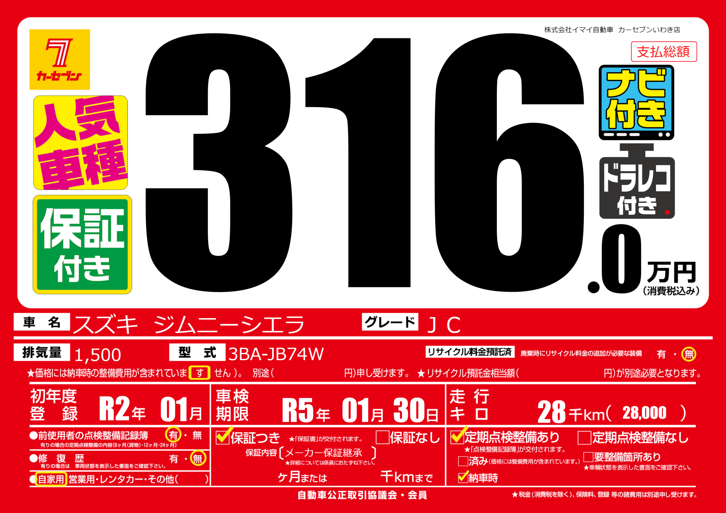 | 車名 | スズキ ジムニーシエラ | グレード ミッション 排気量 |