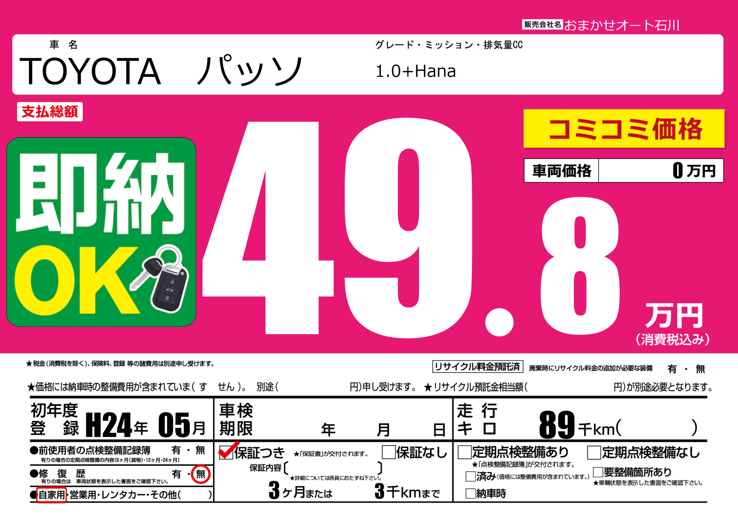 | 車名 | TOYOTA パッソ | グレード ミッション 排気量 |