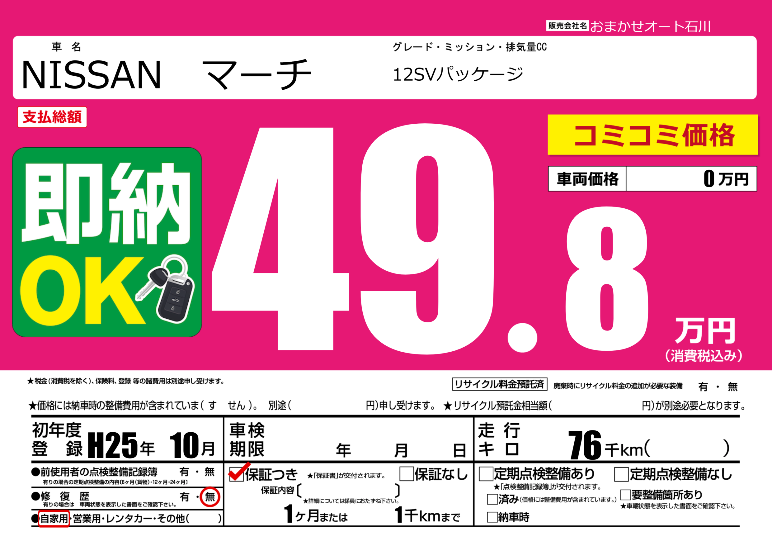 | 車名 | NISSAN マーチ | グレード ミッション 排気量 |