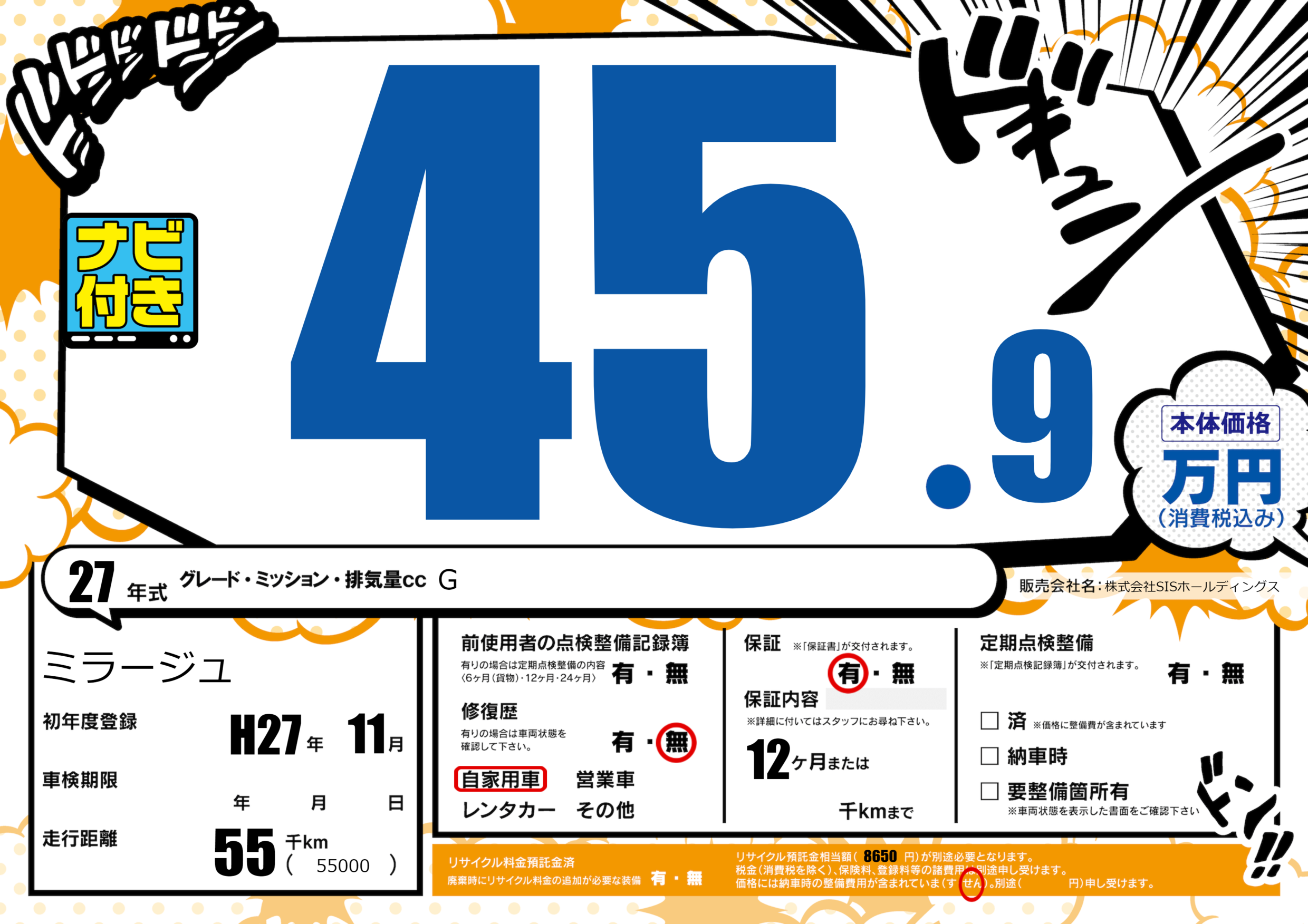| 走行キロ | 5.5万km | 初年度登録 | H27年11月 |