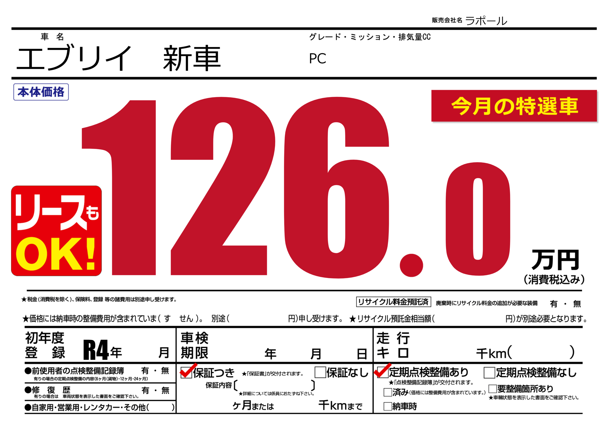| 走行キロ | - | 初年度登録 | R4年---月 |