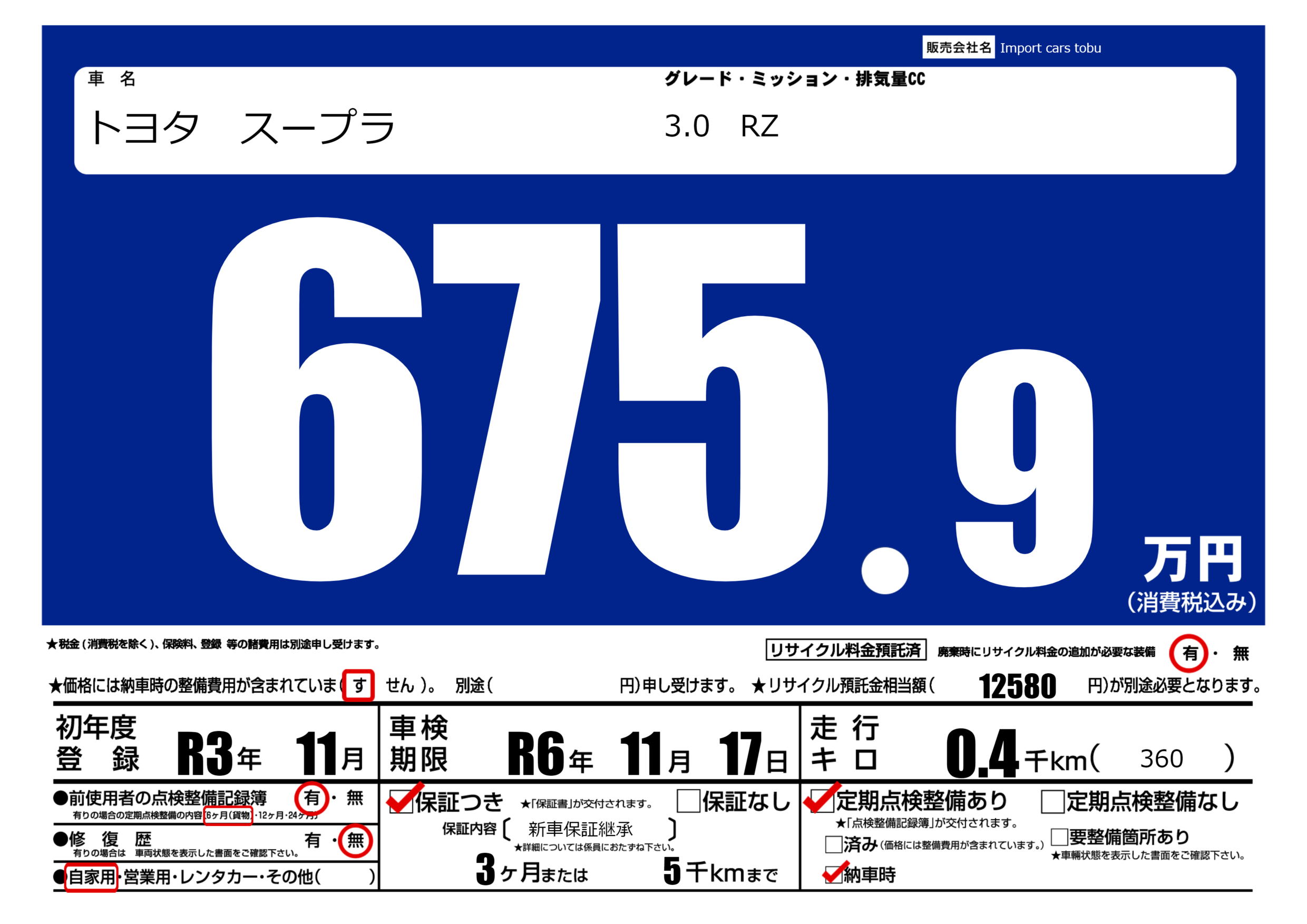 | 車名 | トヨタ スープラ | グレード ミッション 排気量 |