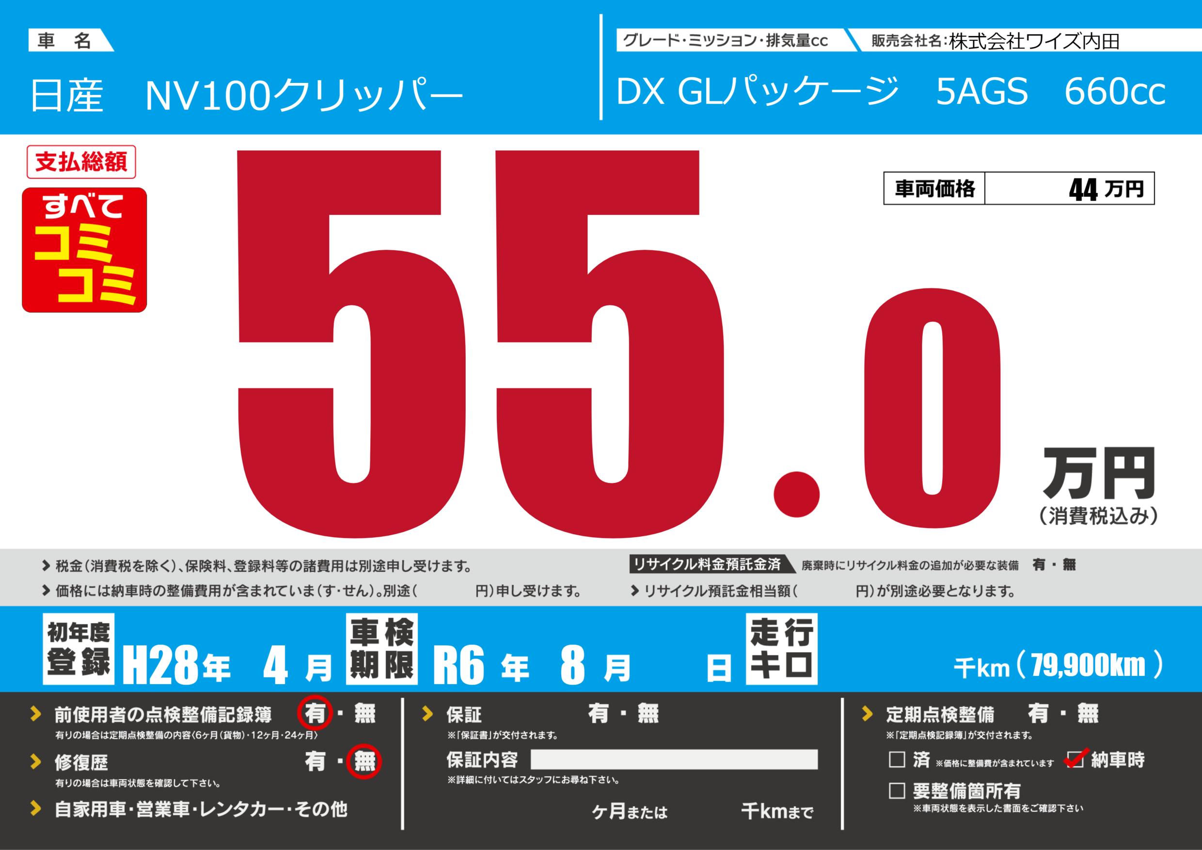 | 車名 | 日産 NV100クリッパー | グレード ミッション 排気量 |