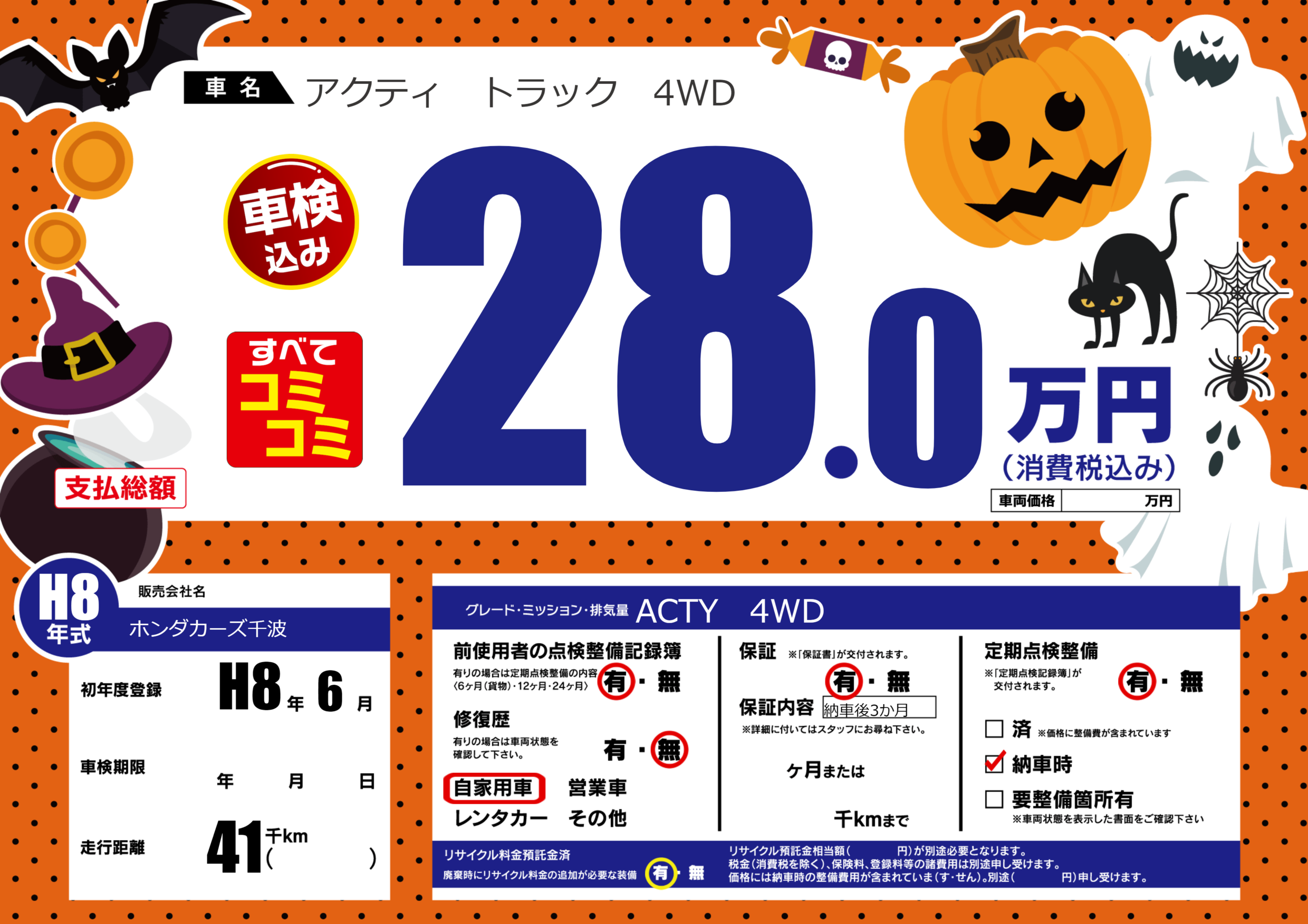 保証付き 保証内容(納車後3か月) ---ヶ月または()千kmまで |