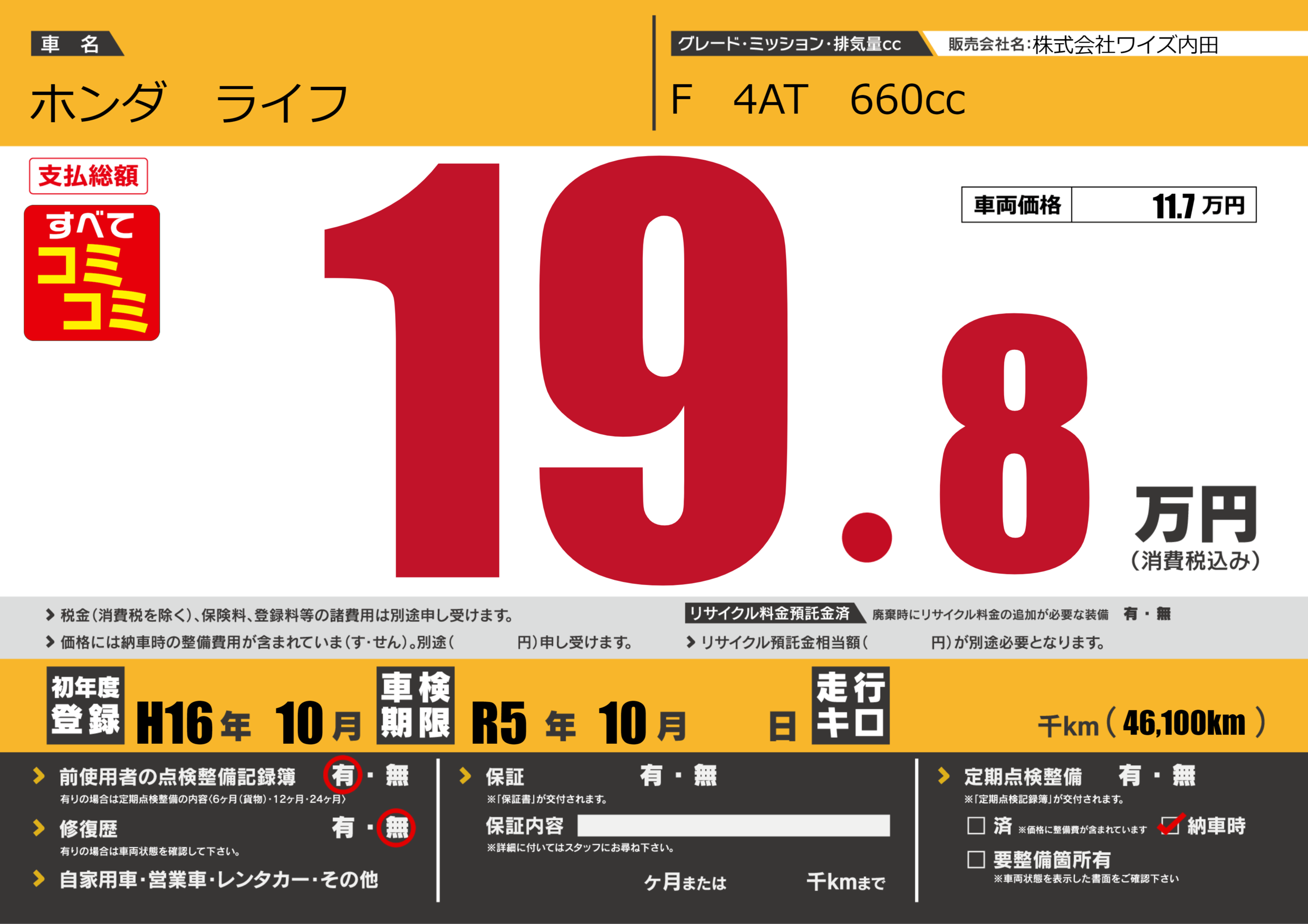 | 車名 | ホンダ ライフ | グレード ミッション 排気量 |
