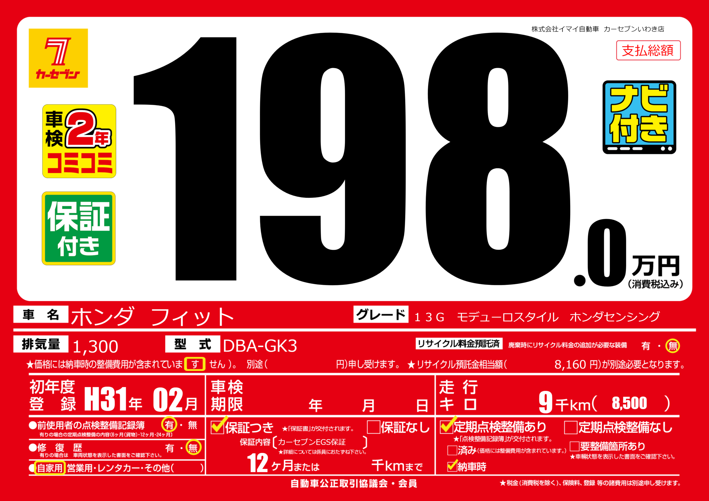 保証付き 保証内容(カーセブンEGS保証) 12ヶ月または千km |