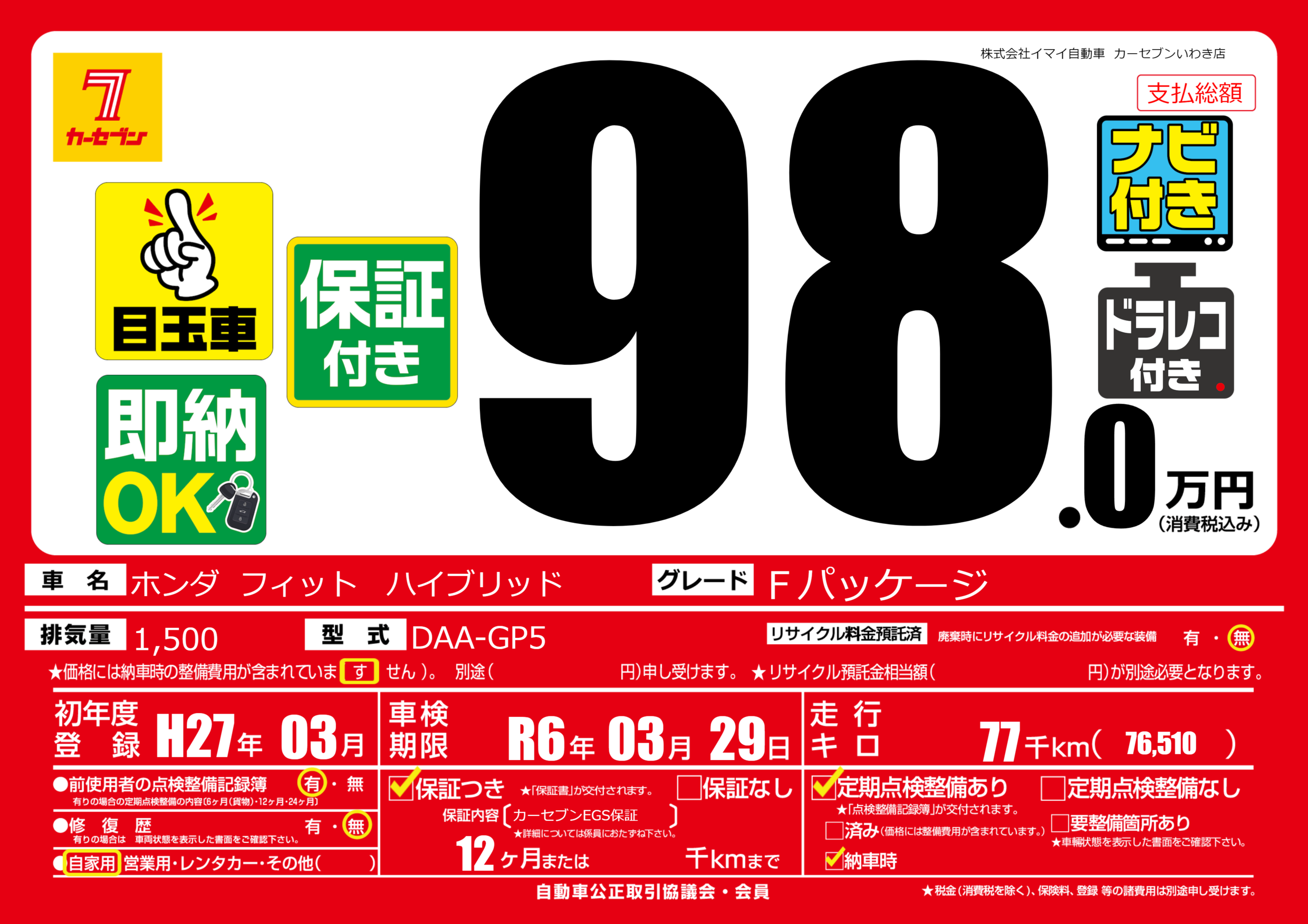 | 走行キロ | 7.7万km | ||