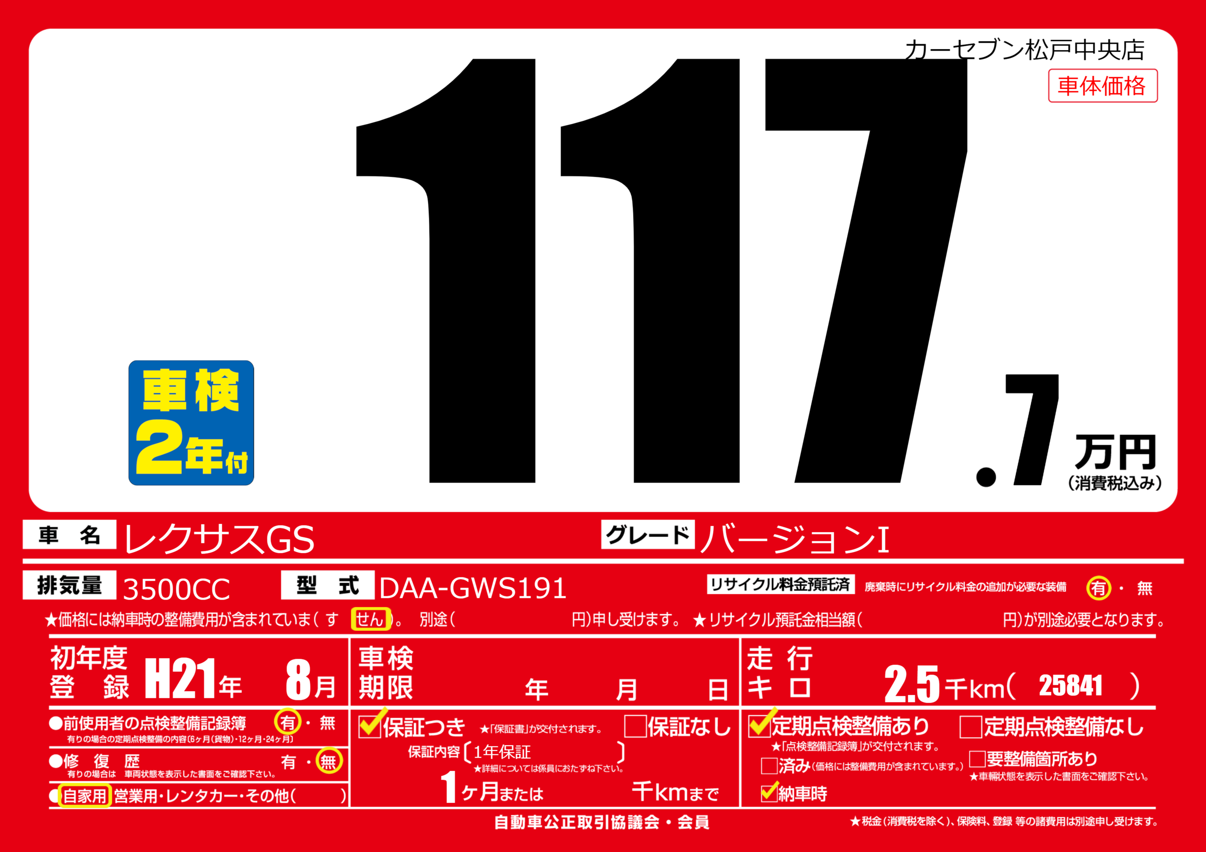 | 車名 | レクサスGS | グレード ミッション 排気量 |
