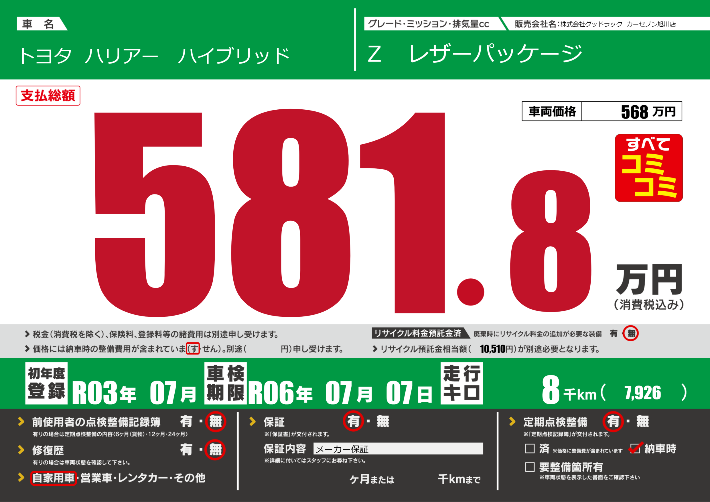 | 走行キロ | 0.8万km | 初年度登録 | R03年07月 |