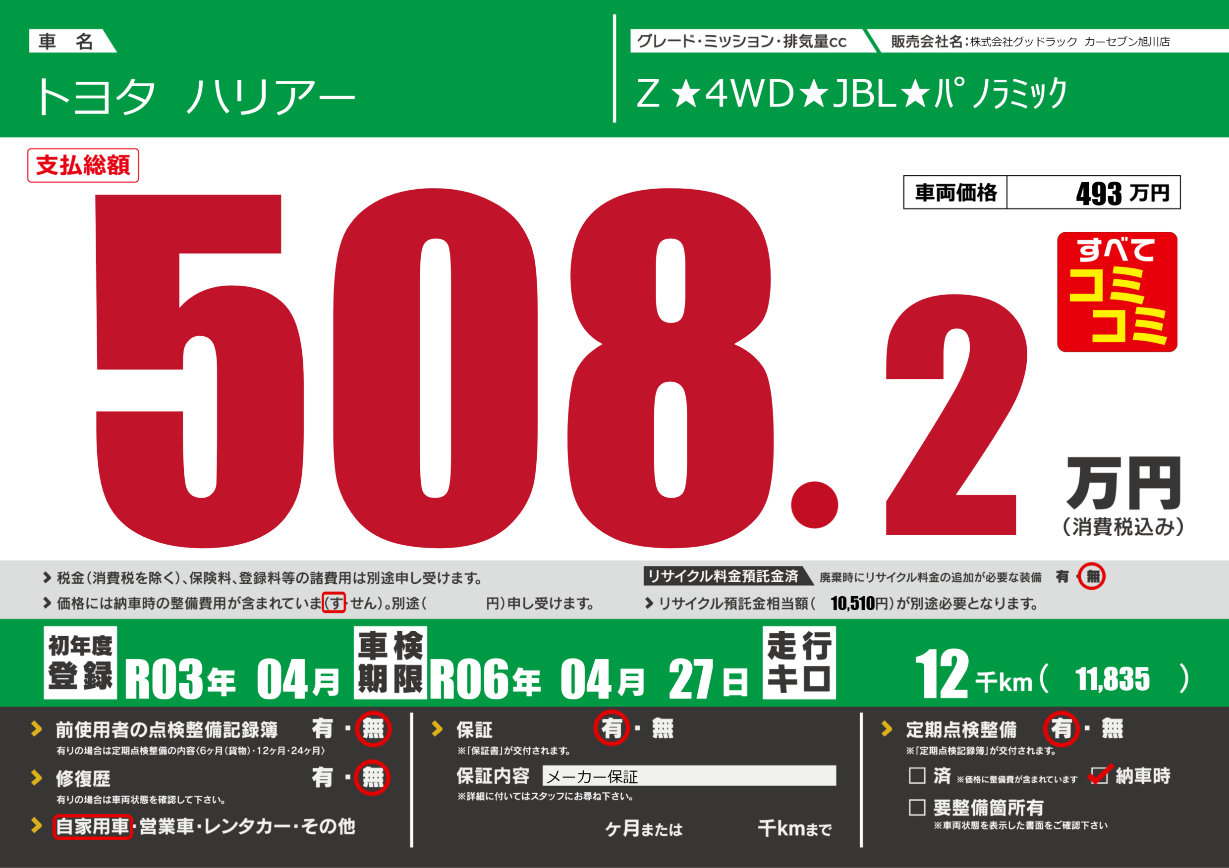 | 走行キロ | 1.2万km | 初年度登録 | R03年04月 |