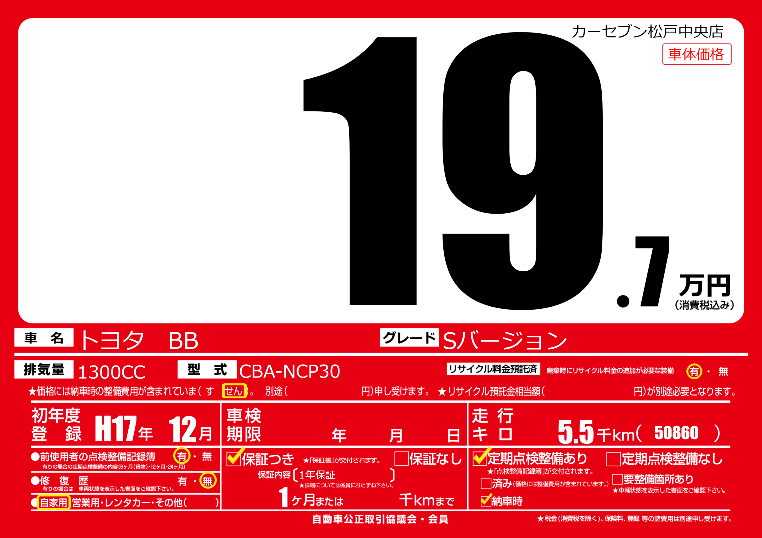 | 車名 | トヨタ BB | グレード ミッション 排気量 |