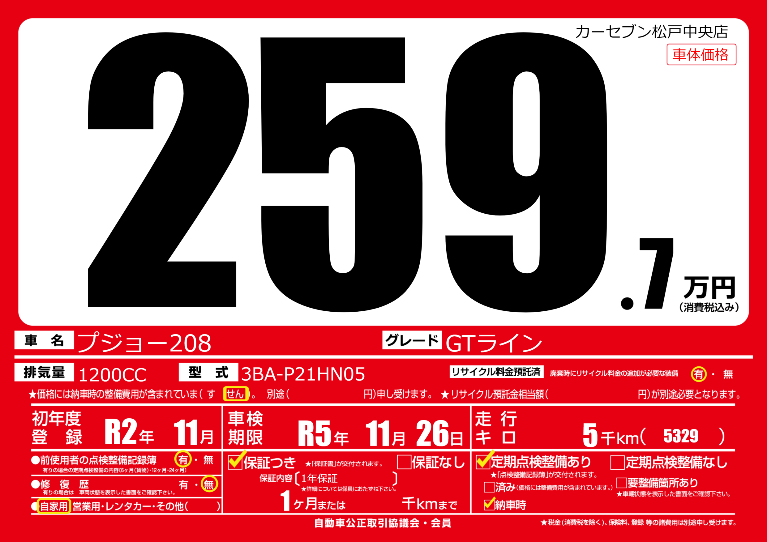 | 車名 | プジョー208 | グレード ミッション 排気量 |