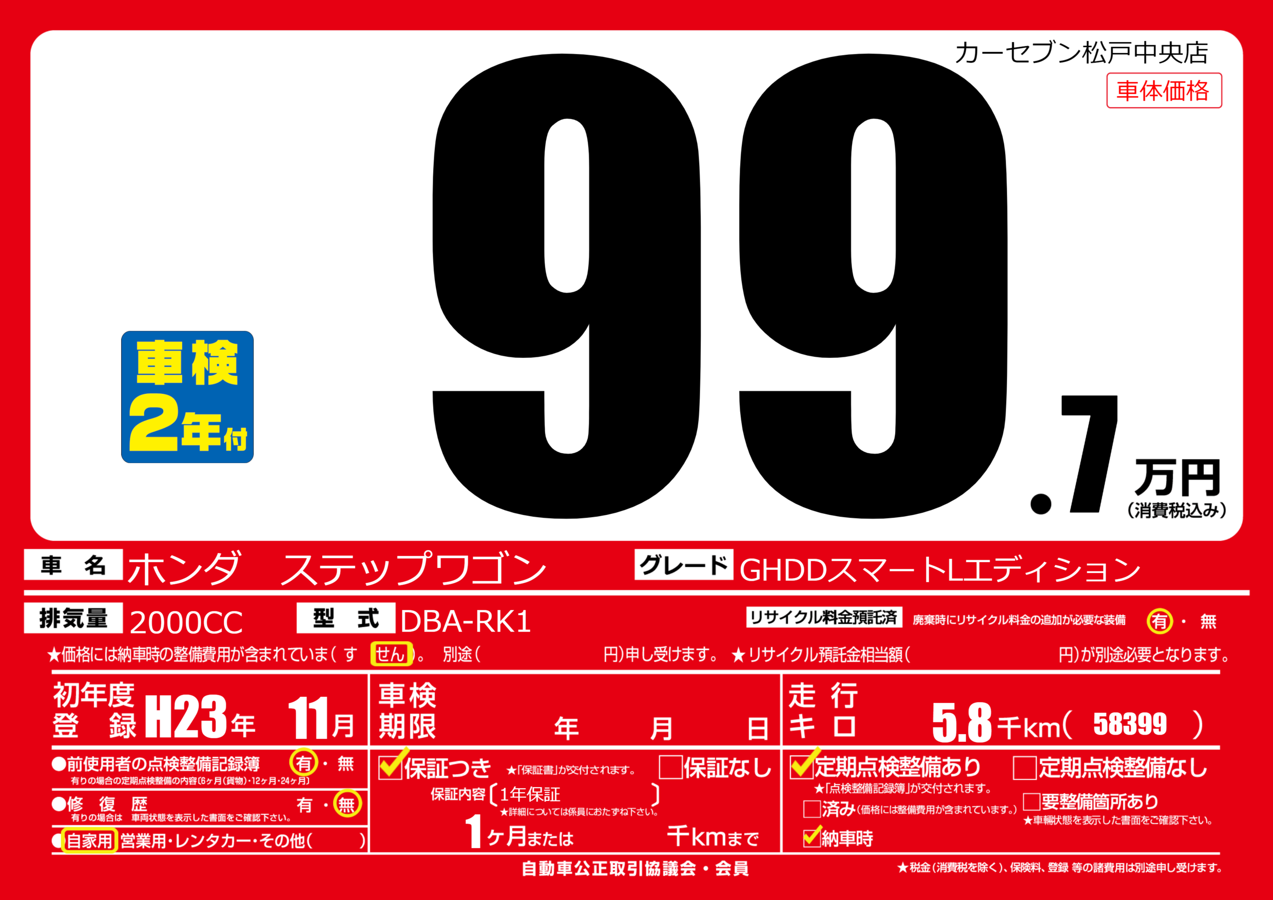 | 走行キロ | 0.5万km | 初年度登録 | H23年11月 |