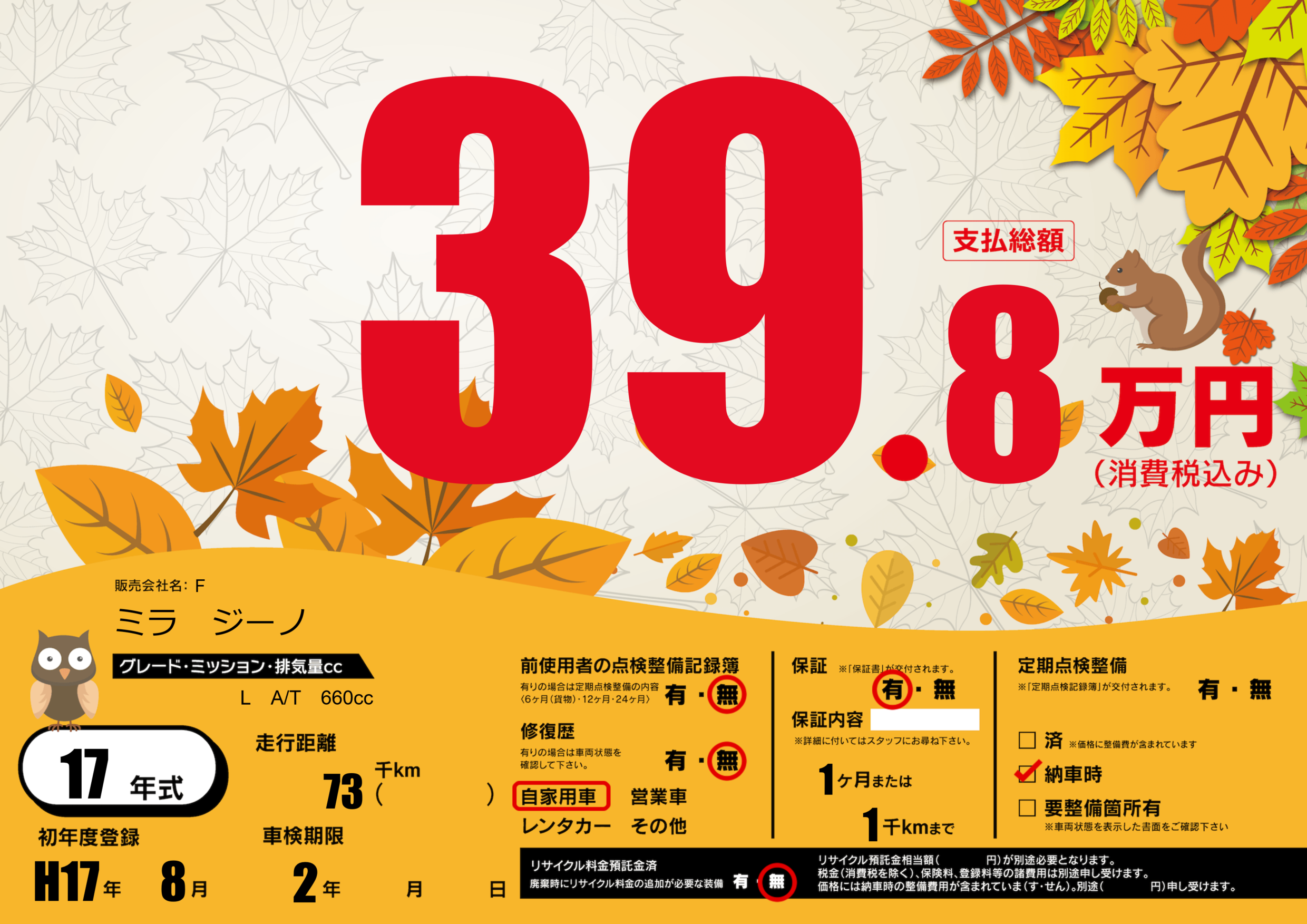 | 車名 | ミラ ジーノ | グレード ミッション 排気量 |