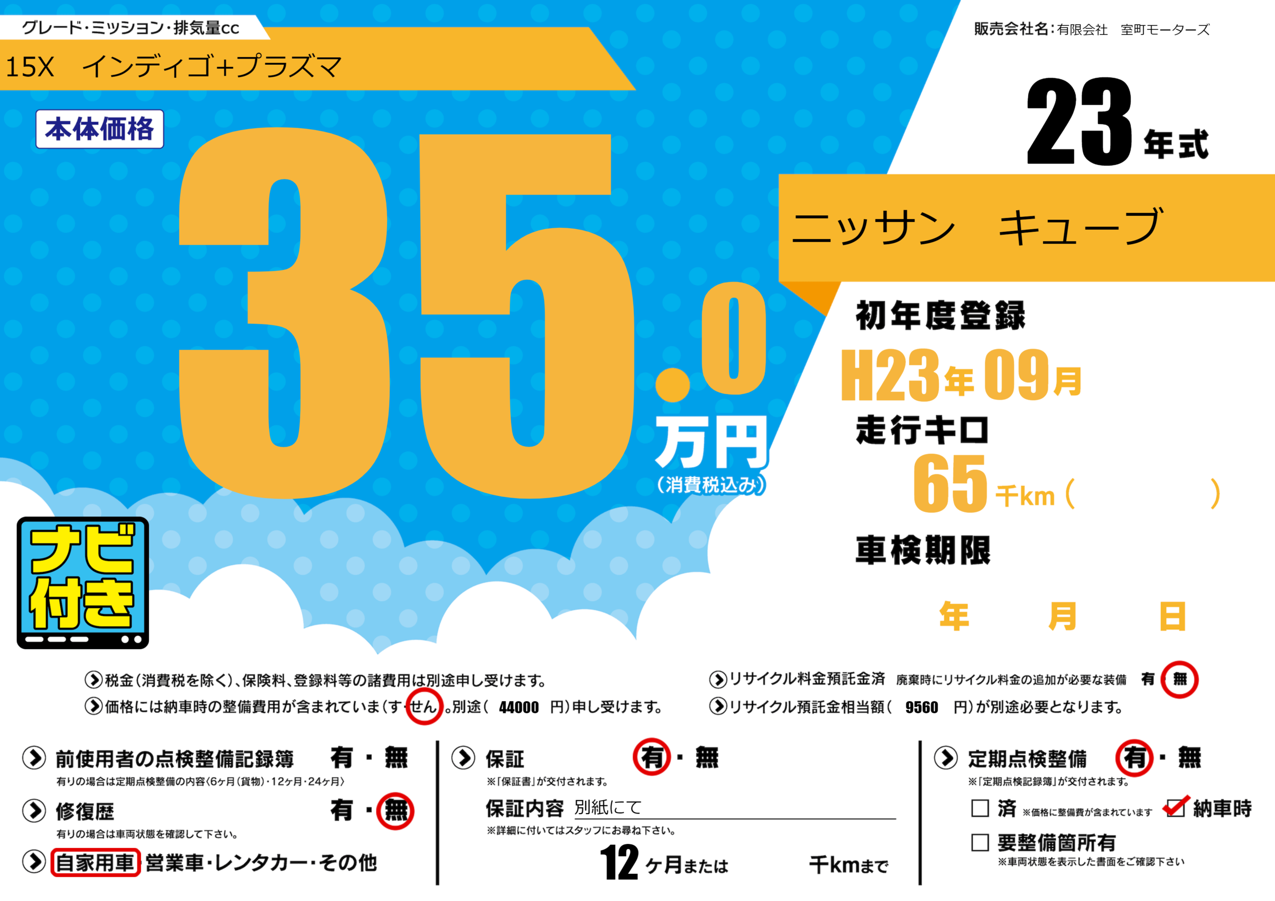 保証付き 保証内容(別紙にて) 12ヶ月または()千kmまで |