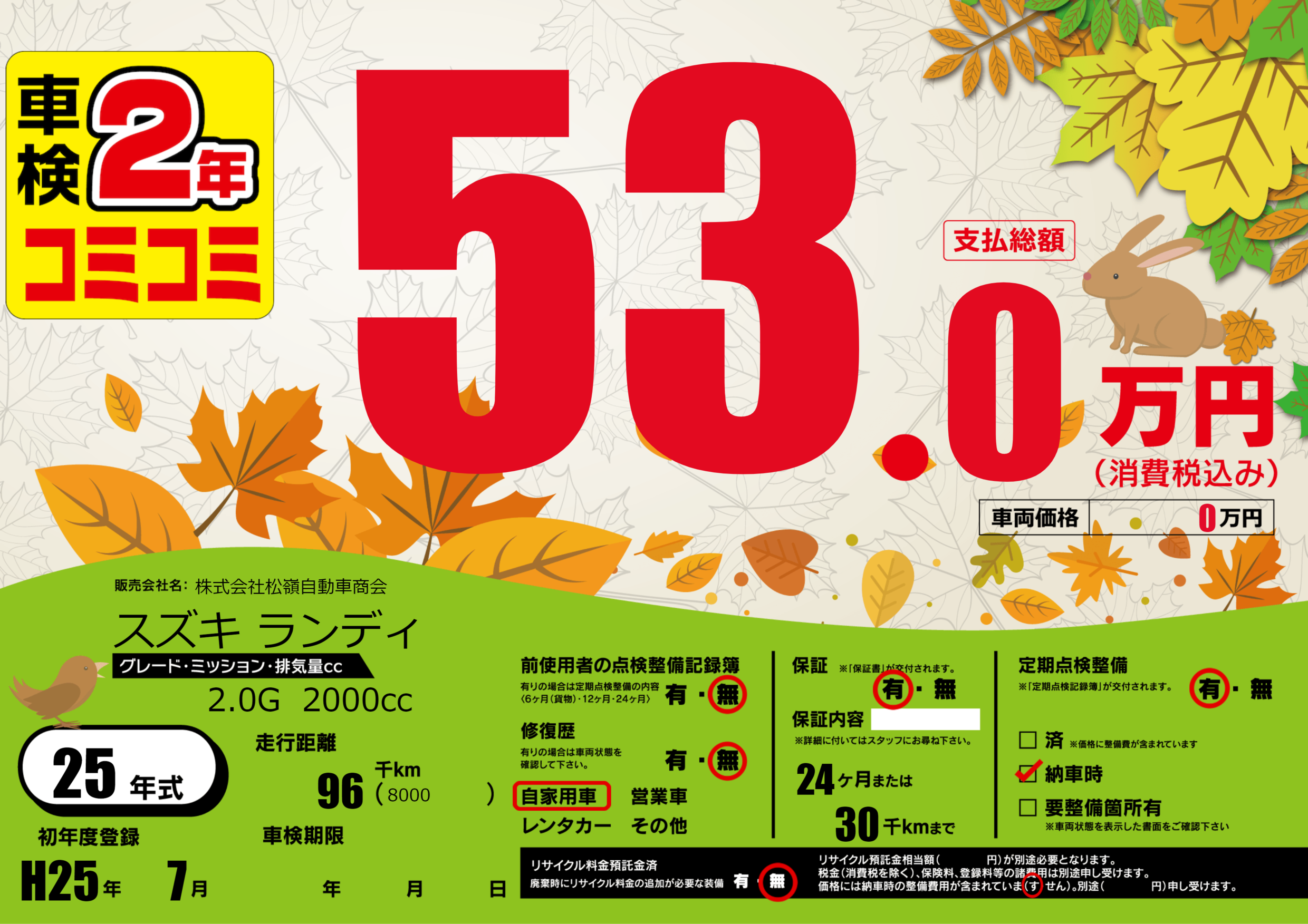 保証付き 保証内容(---) 24ヶ月または(30)千kmまで |