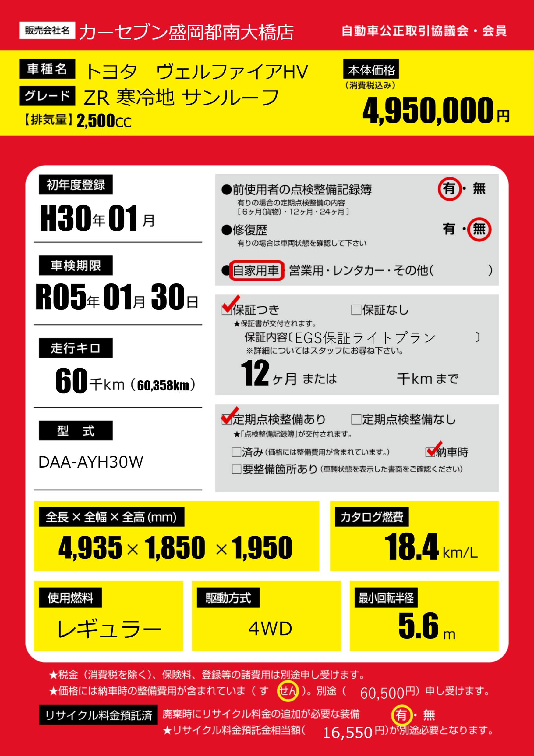 | 車名 | トヨタ ヴェルファイアHV | グレード ミッション 排気量 |