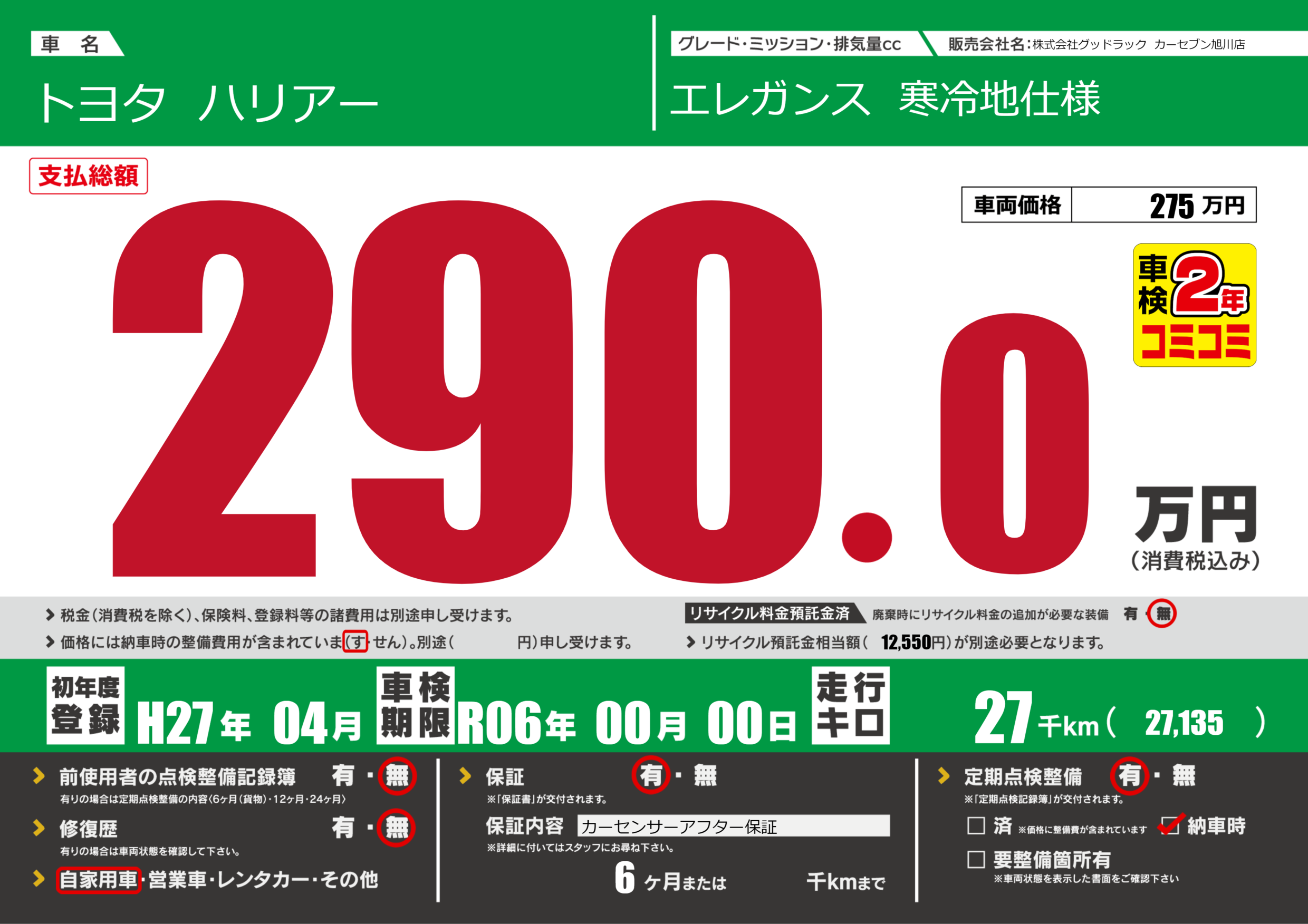 | 走行キロ | 2.7万km | 初年度登録 | H27年04月 |