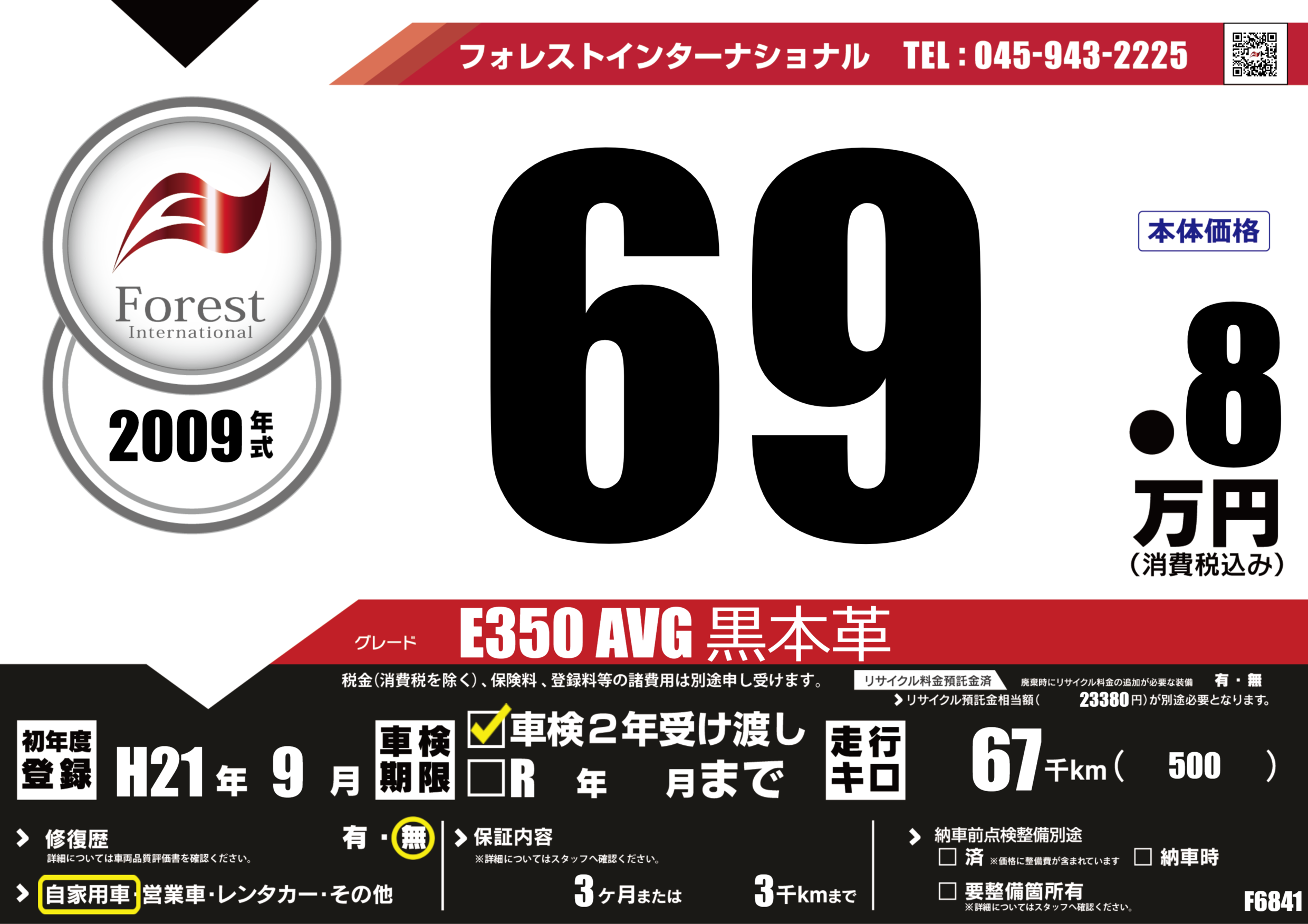 | 走行キロ | 6.7万km | 初年度登録 | H21年9月 |