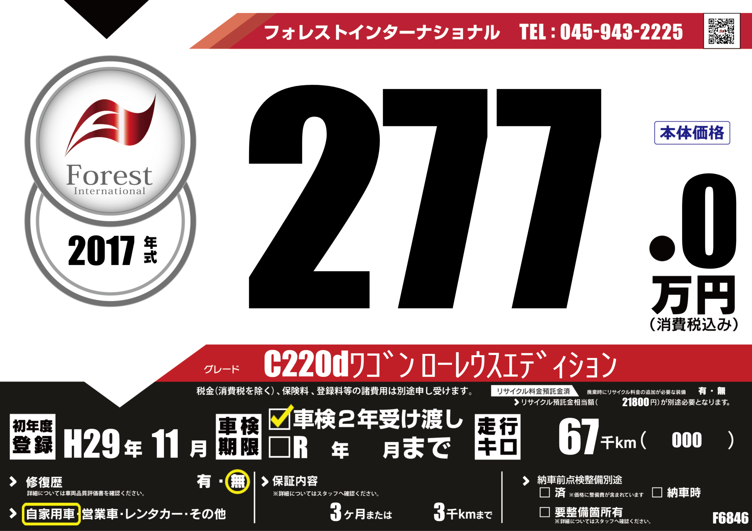 | 走行キロ | 6.7万km | 初年度登録 | H29年11月 |