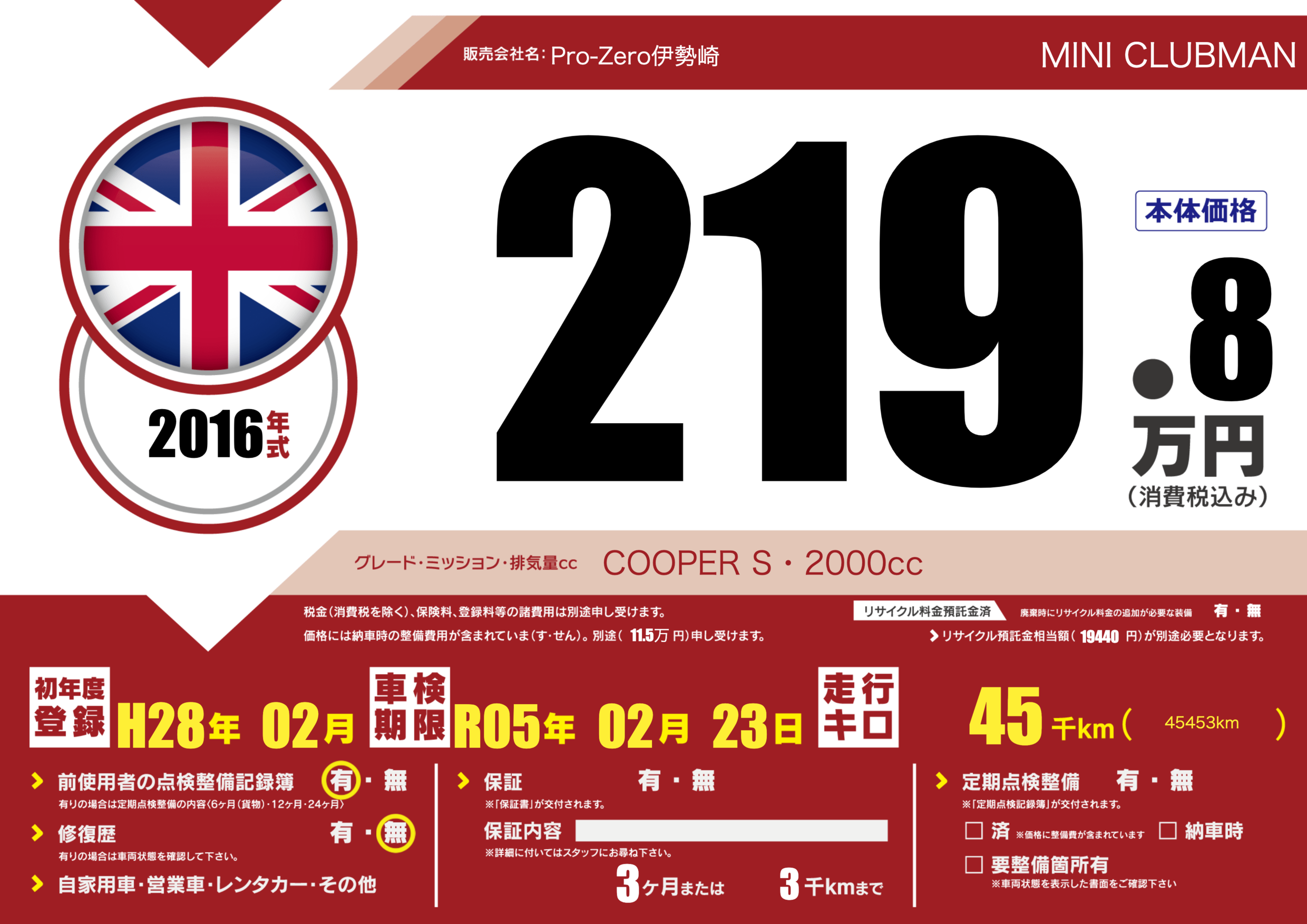 | 車名 | MINI CLUBMAN | グレード ミッション 排気量 |