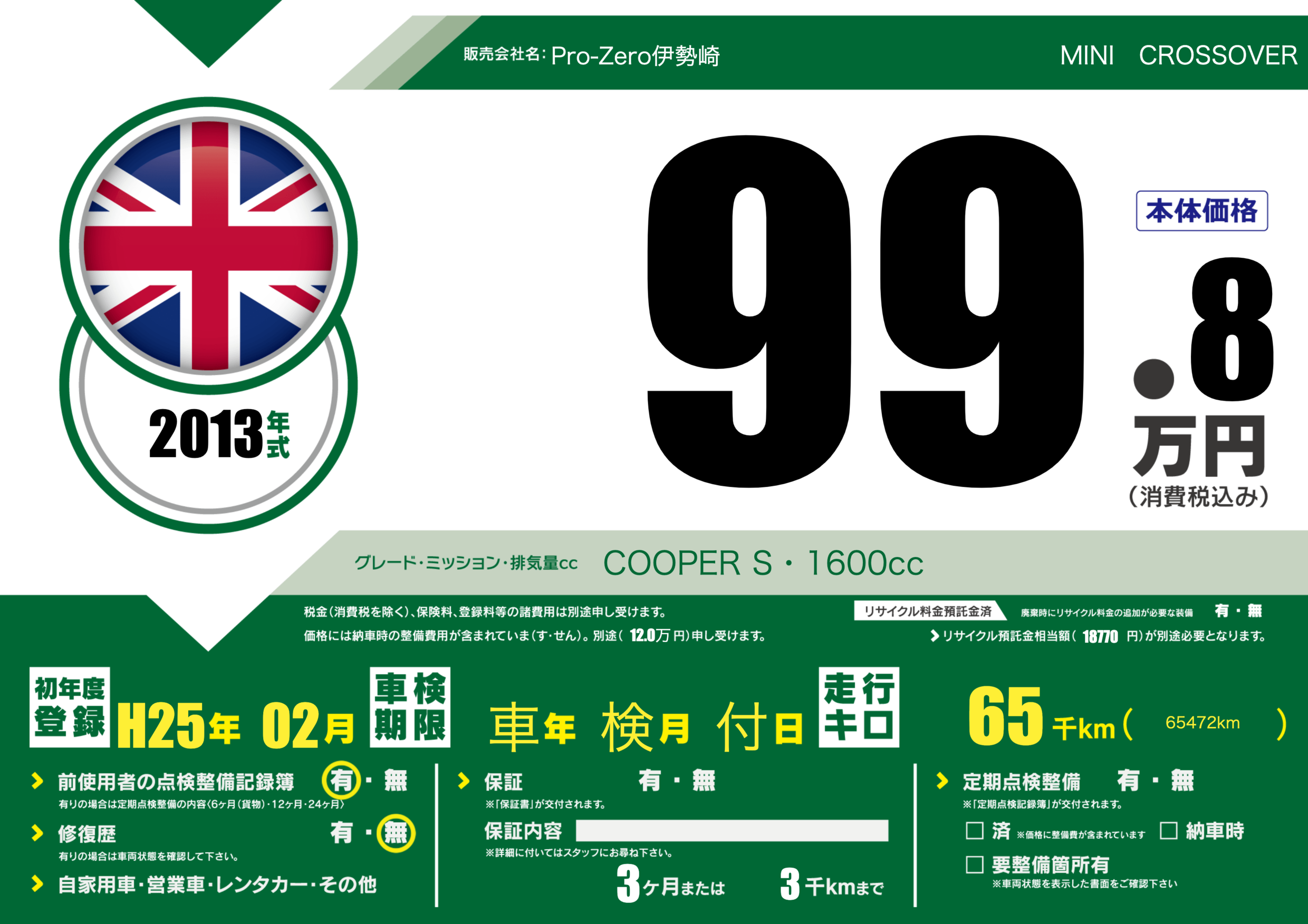 | 車名 | MINI CROSSOVER | グレード ミッション 排気量 |
