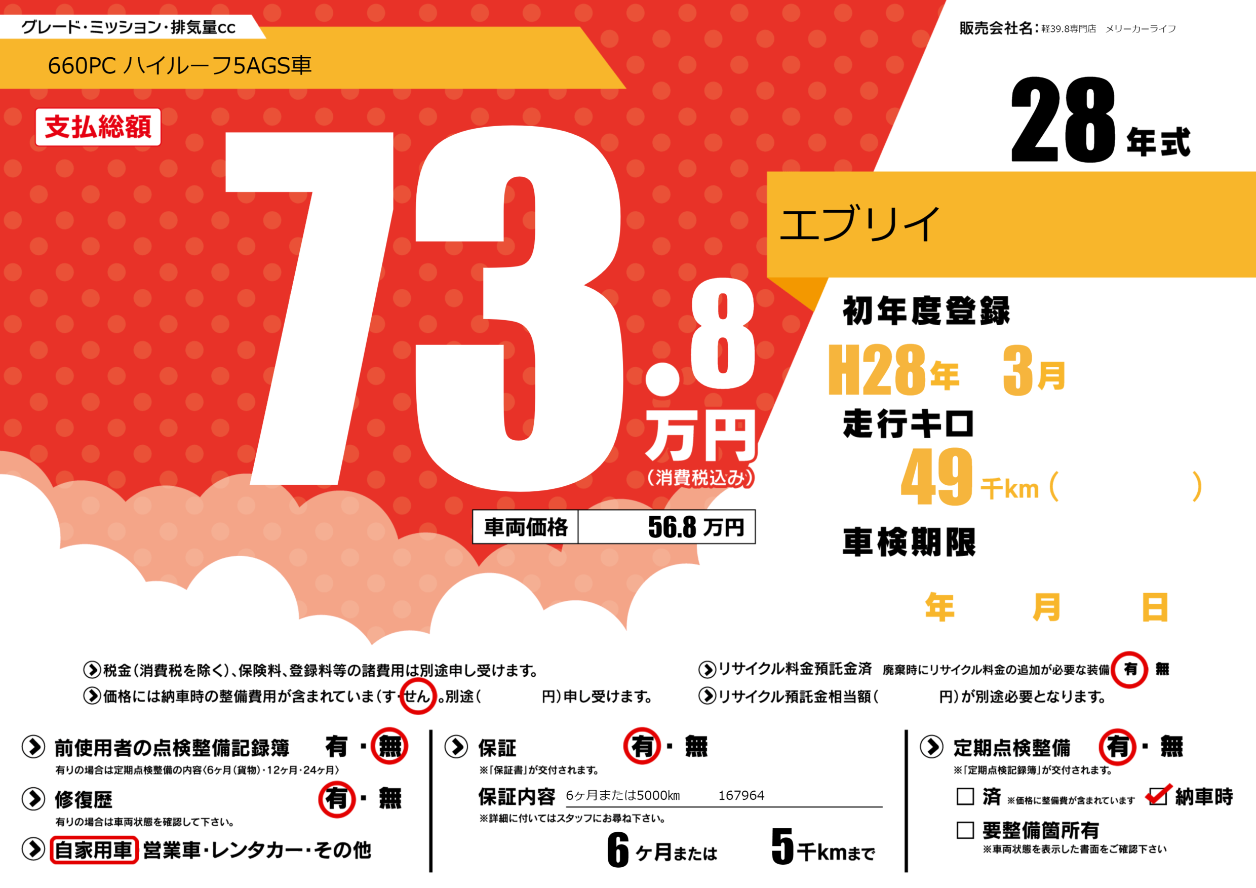 | 走行キロ | 4.9万km | 初年度登録 | H28年3月 |