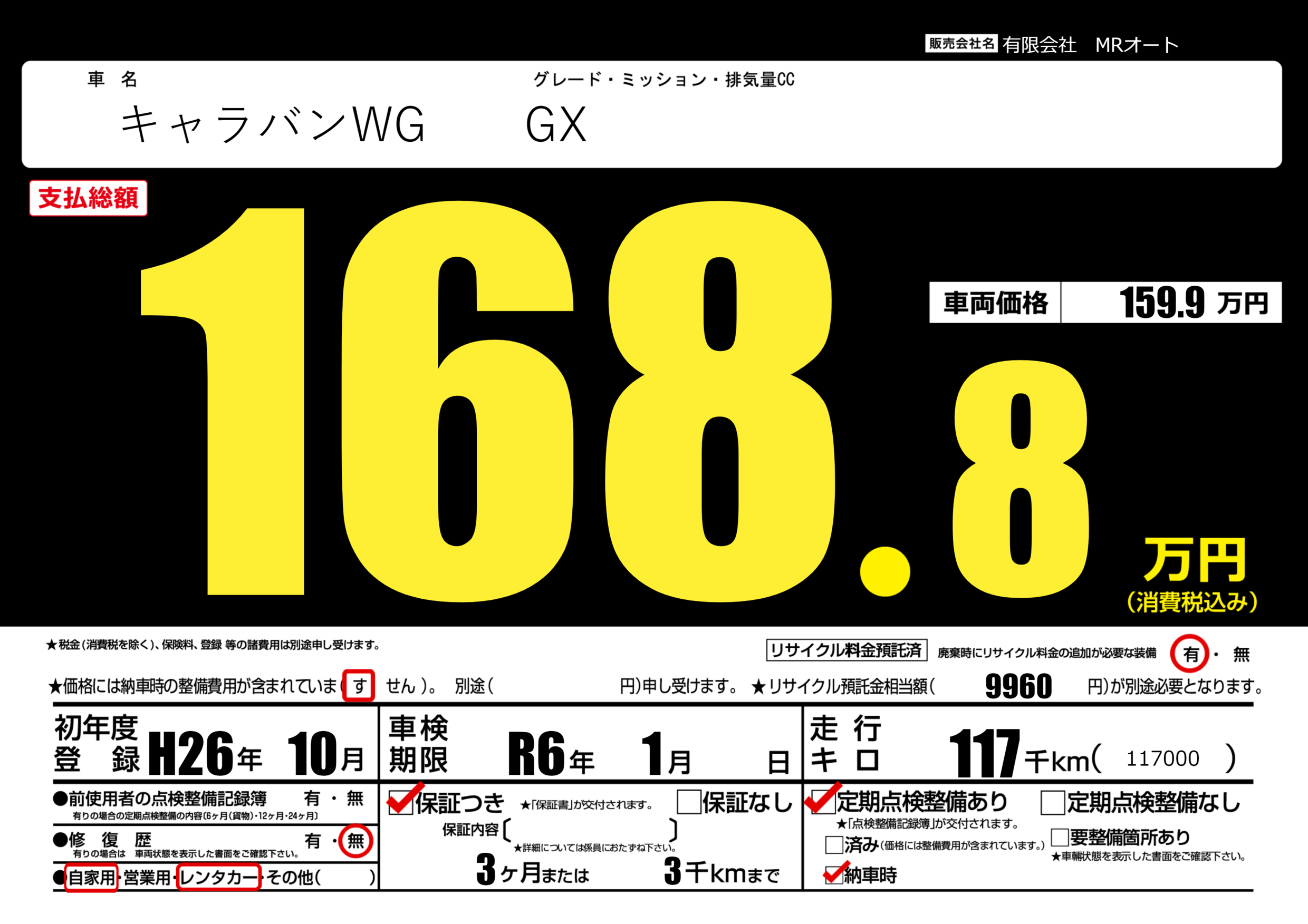 | 車名 | キャラバンWG | グレード ミッション 排気量 |