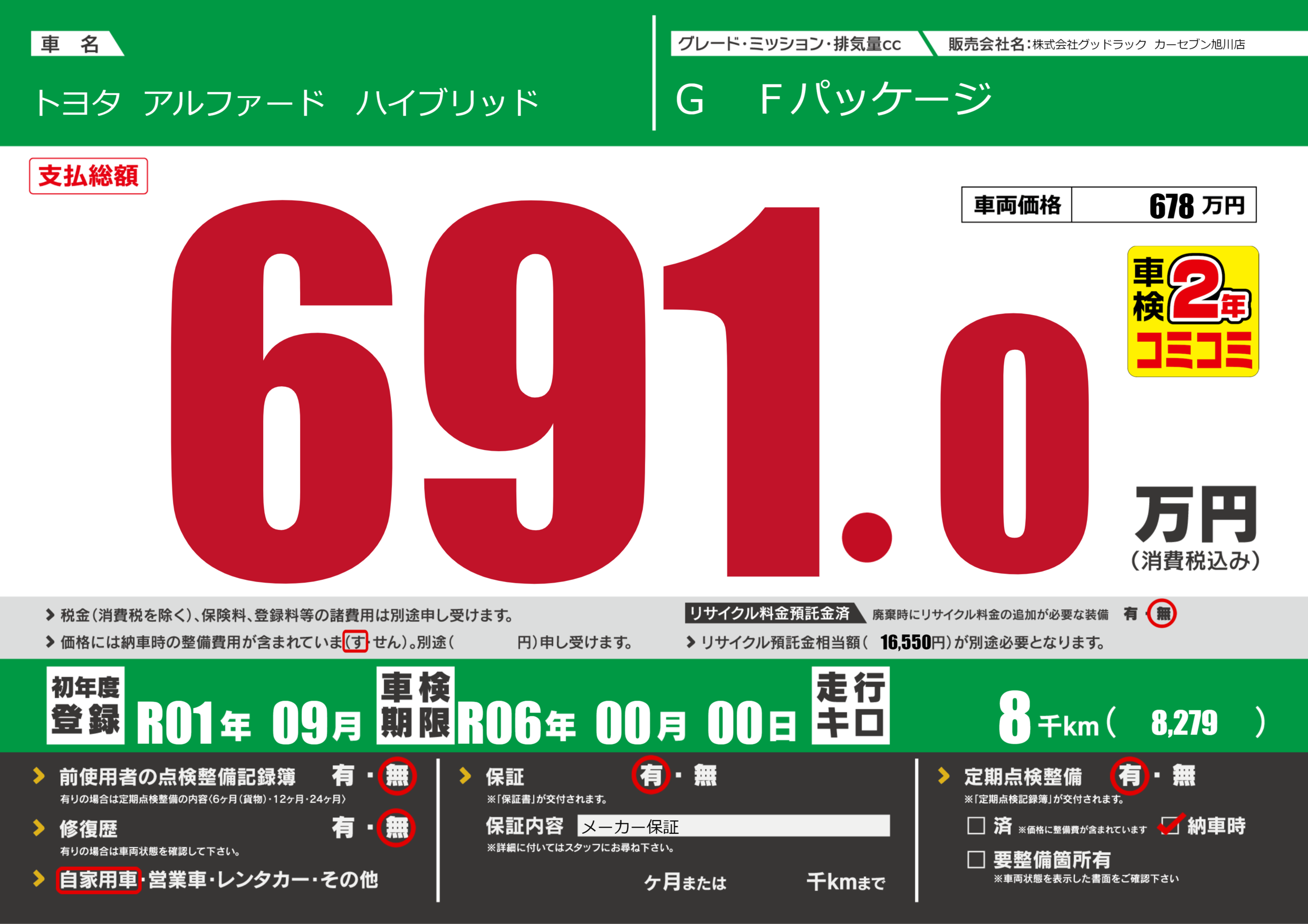 | 走行キロ | 0.8万km | 初年度登録 | R01年09月 |