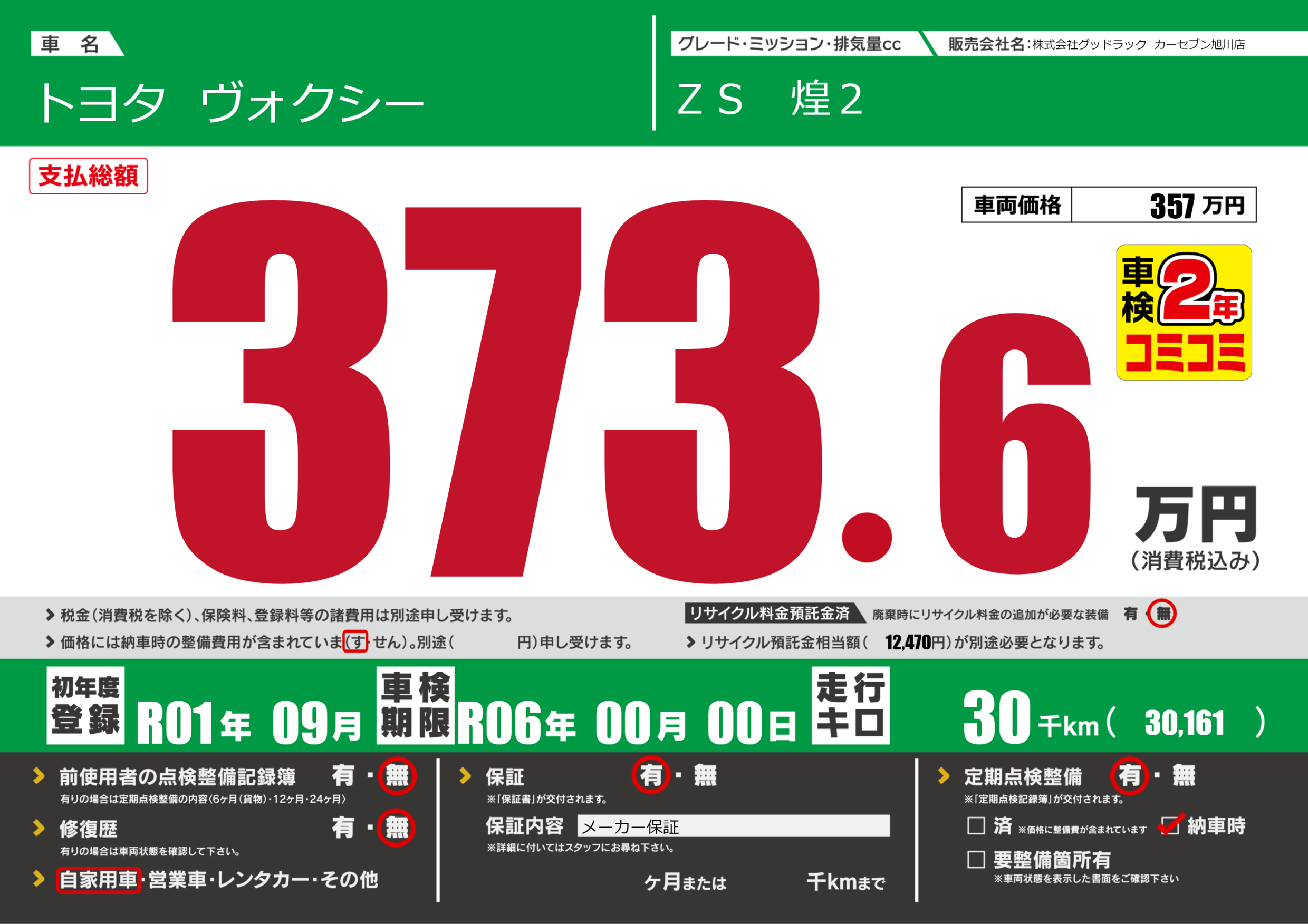 | 走行キロ | 3万km | 初年度登録 | R01年09月 |