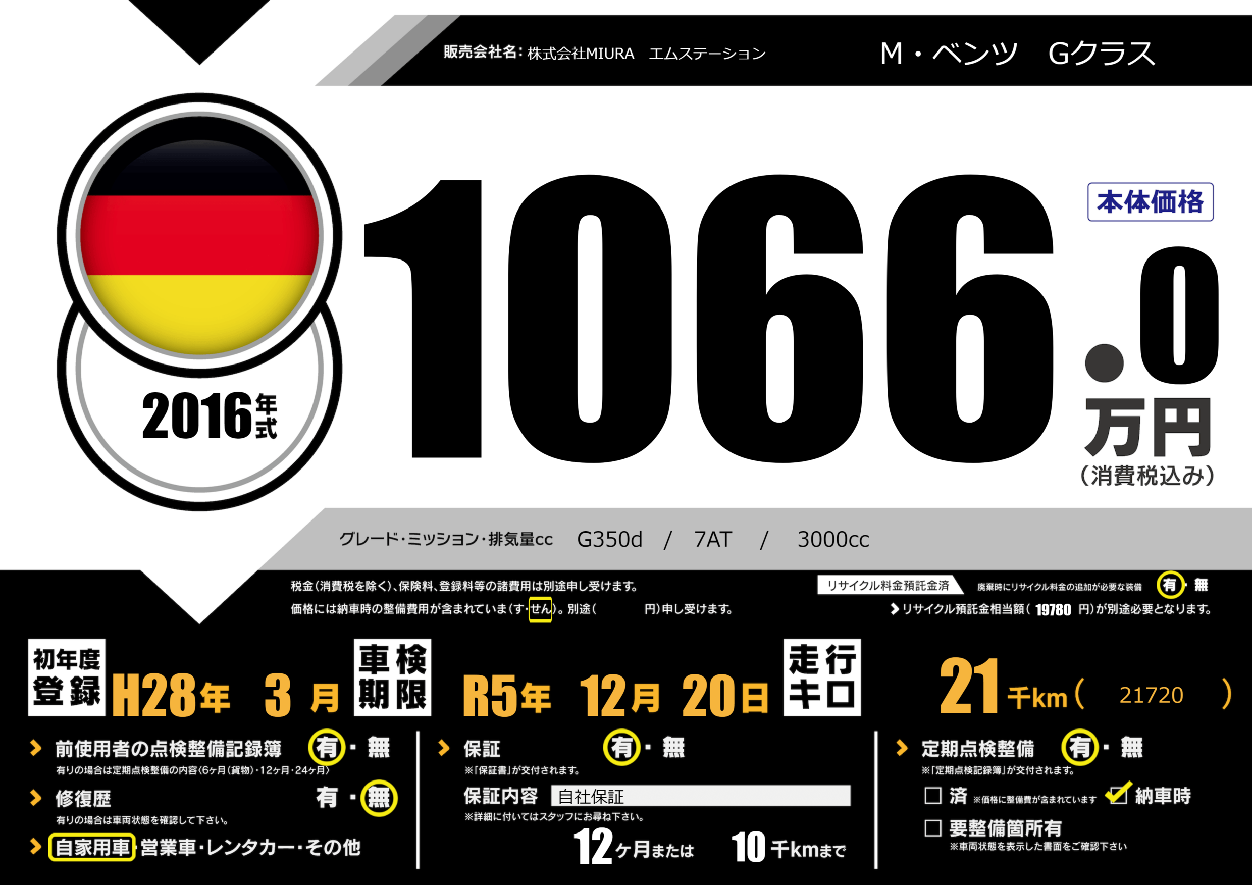 | 車名 | M・ベンツ Gクラス | グレード ミッション 排気量 |