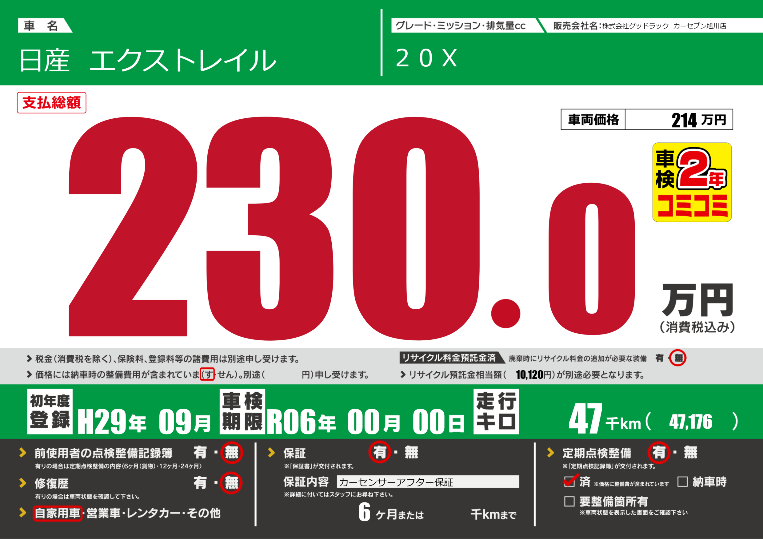 | 定期点検整備 | 定期点検整備あり 定期点検整備済み | ||