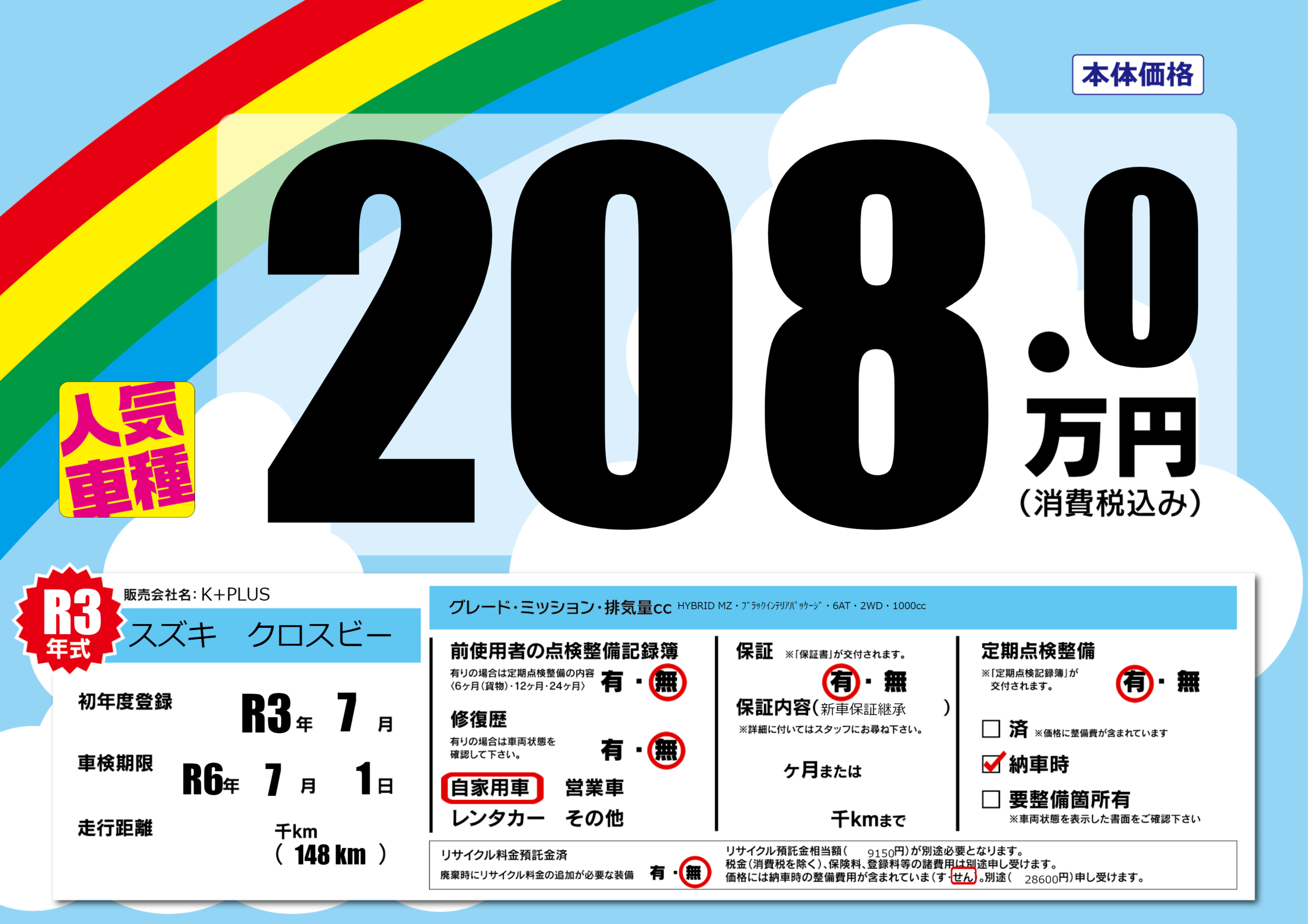 | 定期点検整備 | 定期点検整備あり 納車時あり | ||