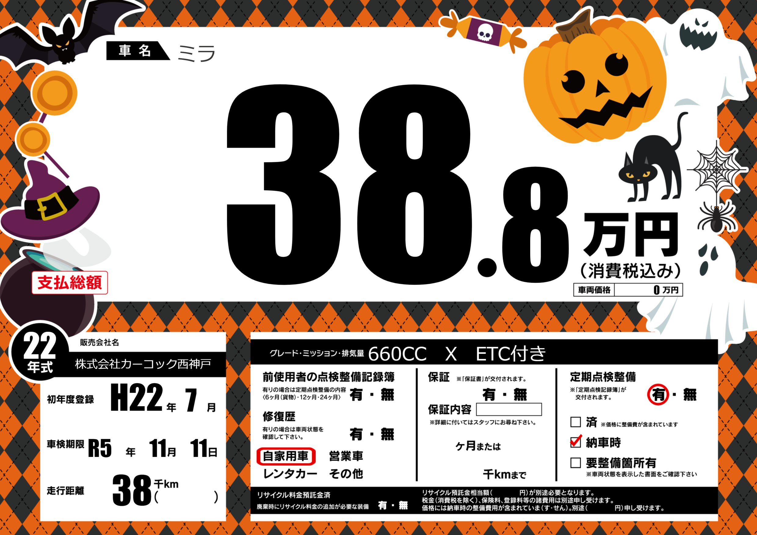 | 走行キロ | 3.8万km | 初年度登録 | H22年7月 |