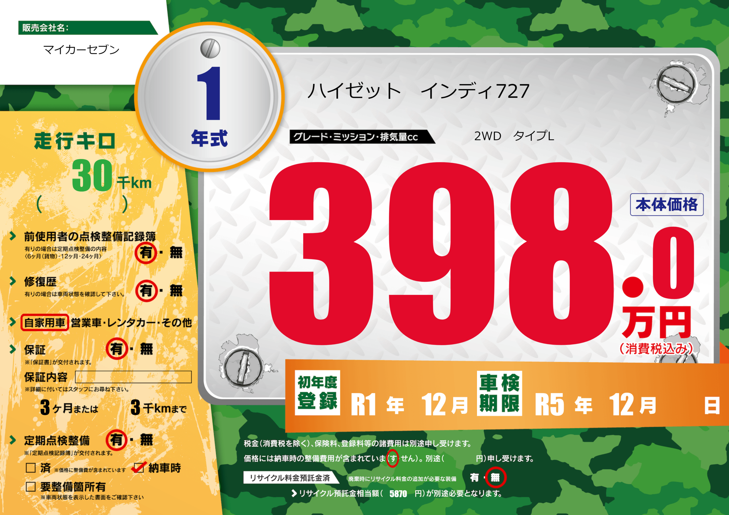 | 車名 | ハイゼット インディ727 | グレード ミッション 排気量 |