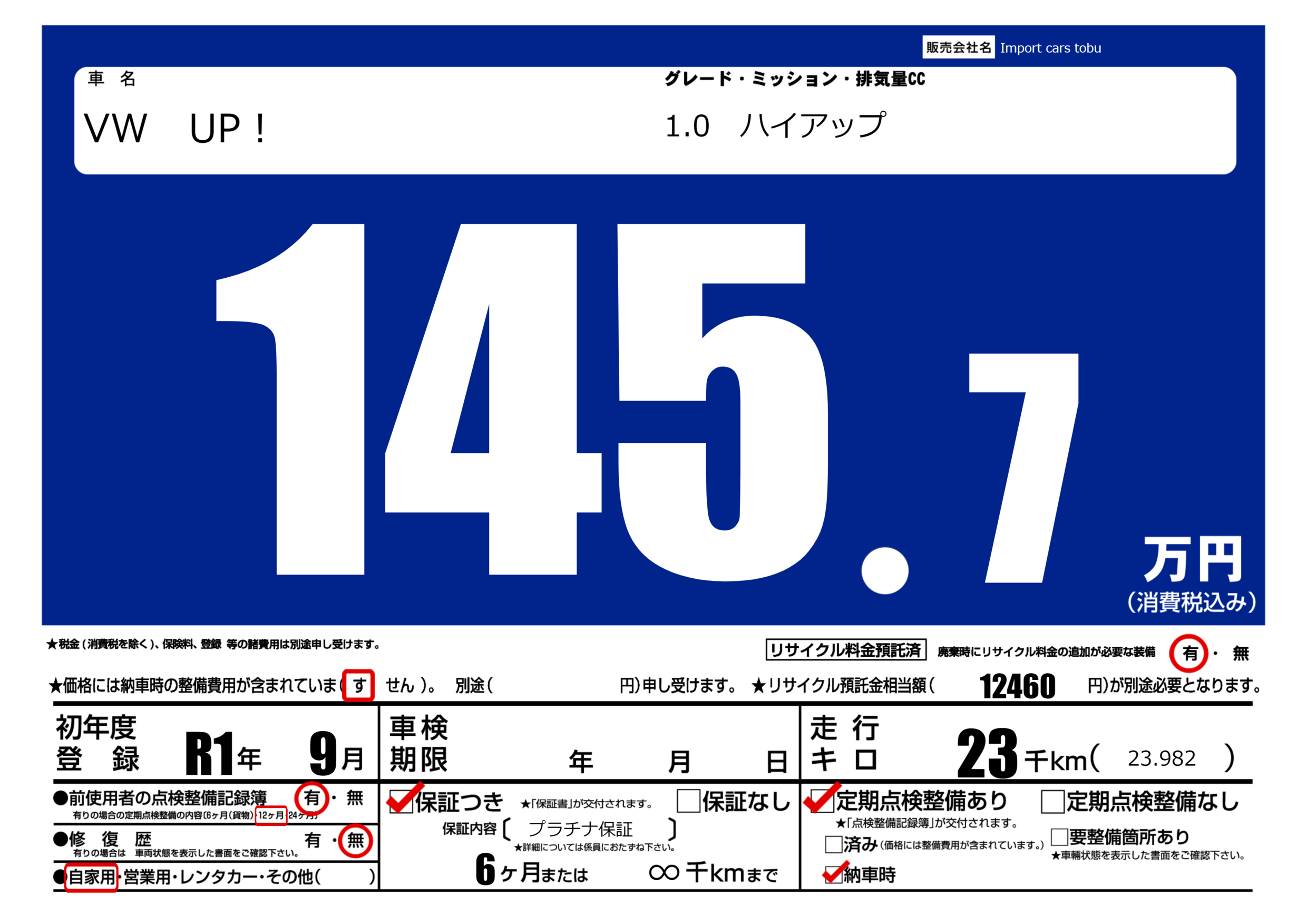 保証付き 保証内容( プラチナ保証) 6ヶ月または(∞)千kmまで |