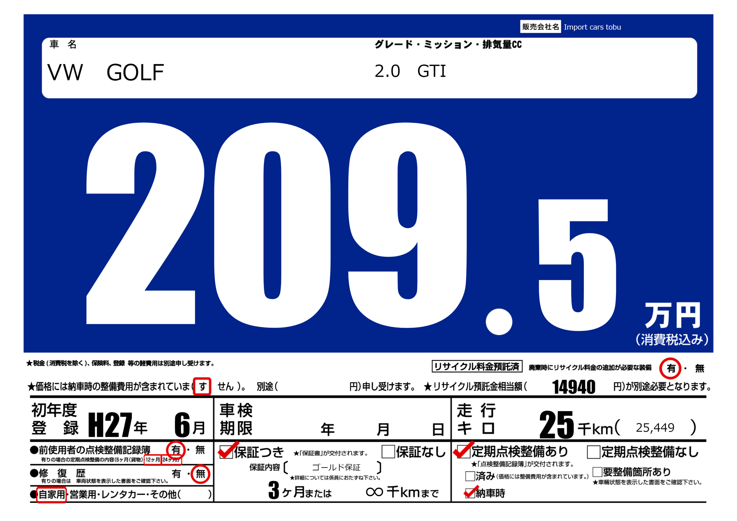 保証付き 保証内容( ゴールド保証) 3ヶ月または(∞)千kmまで |