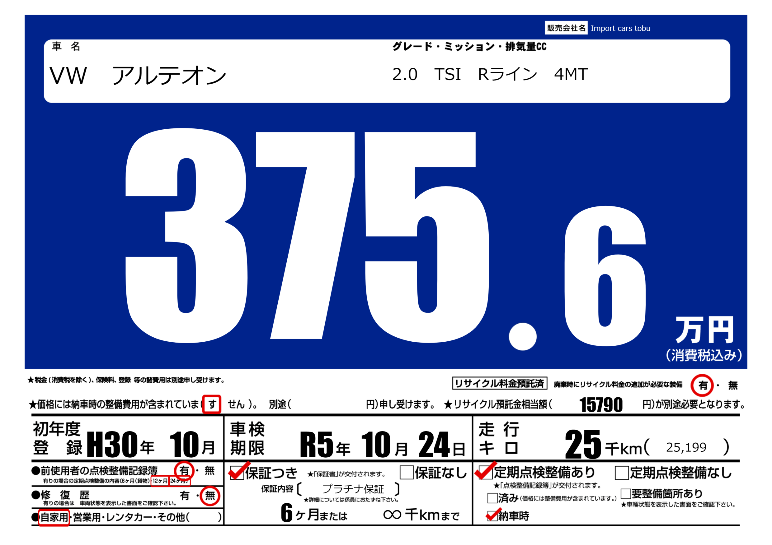 | 車名 | VW アルテオン | グレード ミッション 排気量 |